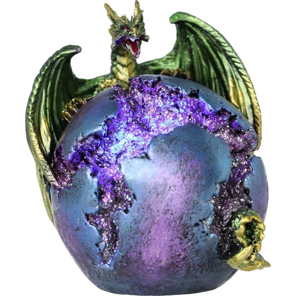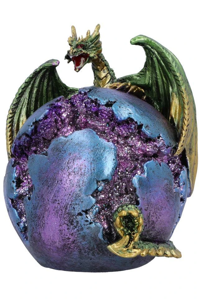 This emerald-green Dragon clings to its sphere fiercely. With golden accents on its under-belly, wingtips and clawed feet, this beast is protecting all it owns from any enemy. The spherical perch has a crevice running across the front, exposing an amethyst geode. Cast in the finest resin before being hand-painted, this monstrous piece will look perfect in any dragon enthusiasts collection.