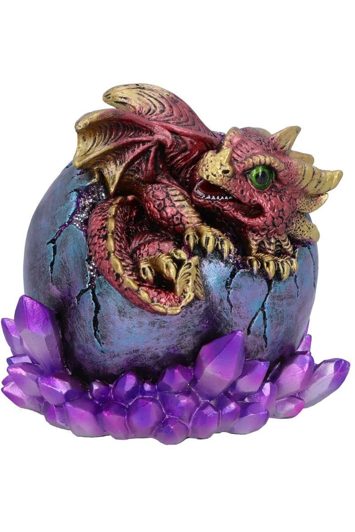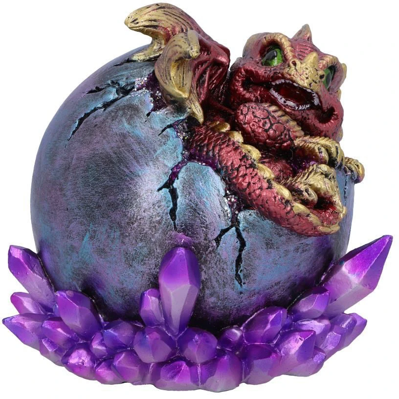 Watch as this wide-eyed creature emerges from its shell into this unfamiliar world. Featuring bright-red scales with golden accents on their claws, horns and wings, this enchantingly adorable dragon is looking into the world for the first time from its metallic purple home. Cast in the finest resin before being expertly hand-painted, this is the ideal gift for any lover of mythical beasts!