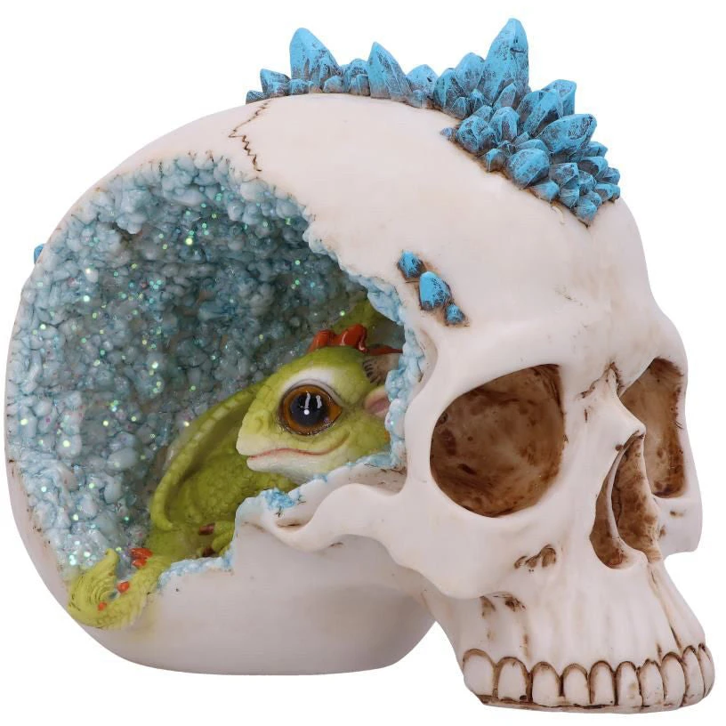 Nestled into the side of a human skull, a green dragon can be seen lying amongst the blue crystals embedded within. Which can also be seen protruding from the top of the skull. Cast in high-quality resin, before being expertly hand-painted this intriguing crystal cave skull is sure to take pride of placement at the centre of your geode or skull collection.