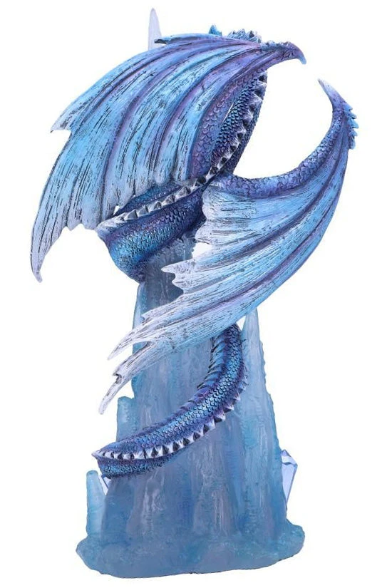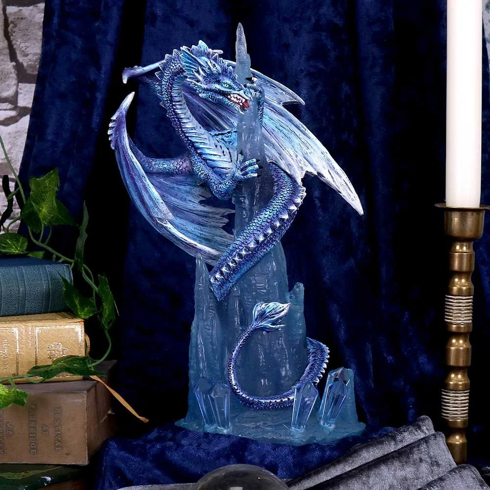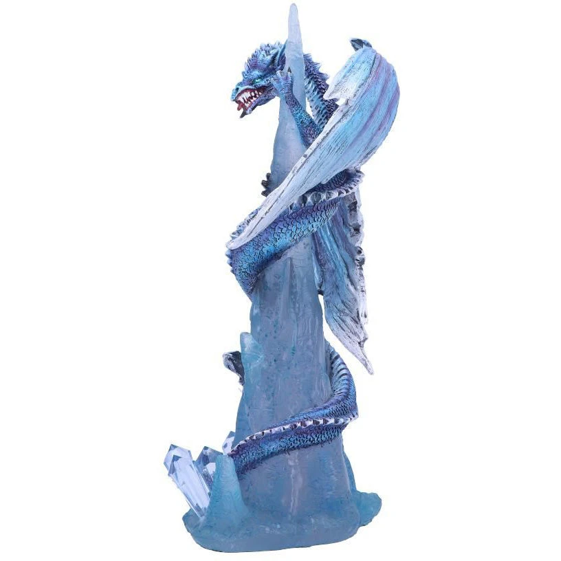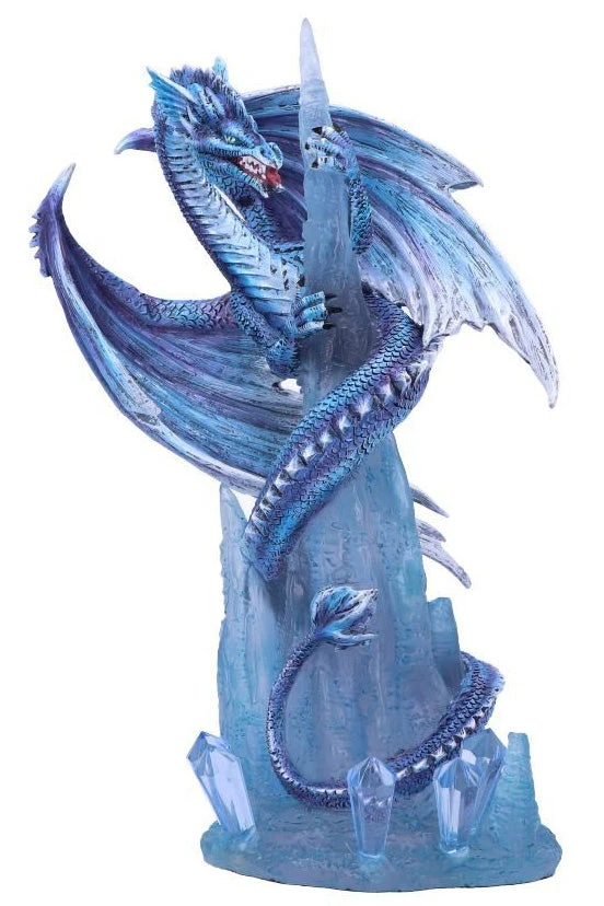 Crystal Custodian: Encompassing a large crystal shard is a fearsome blue dragon. Sneering, it wards off those who dare venture too close. The dragon has white and violet accents on its chest, horns and claws. The dragon holds tightly onto the shard, its tail wrapped around the base for stability. Cast in the finest resin before being hand-painted, this figurine make the perfect addition to any dragon themed collection.