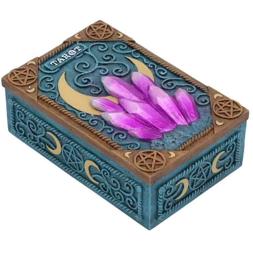 Mimicking a traditional Tarot card, this beautifully crafted box features a selection of Wiccan symbols and patterns. On the lid, large purple crystals form in front of a golden moon crest, which once lifted will reveal your most prized possessions. Cast in the finest resin before being expertly hand-painted.