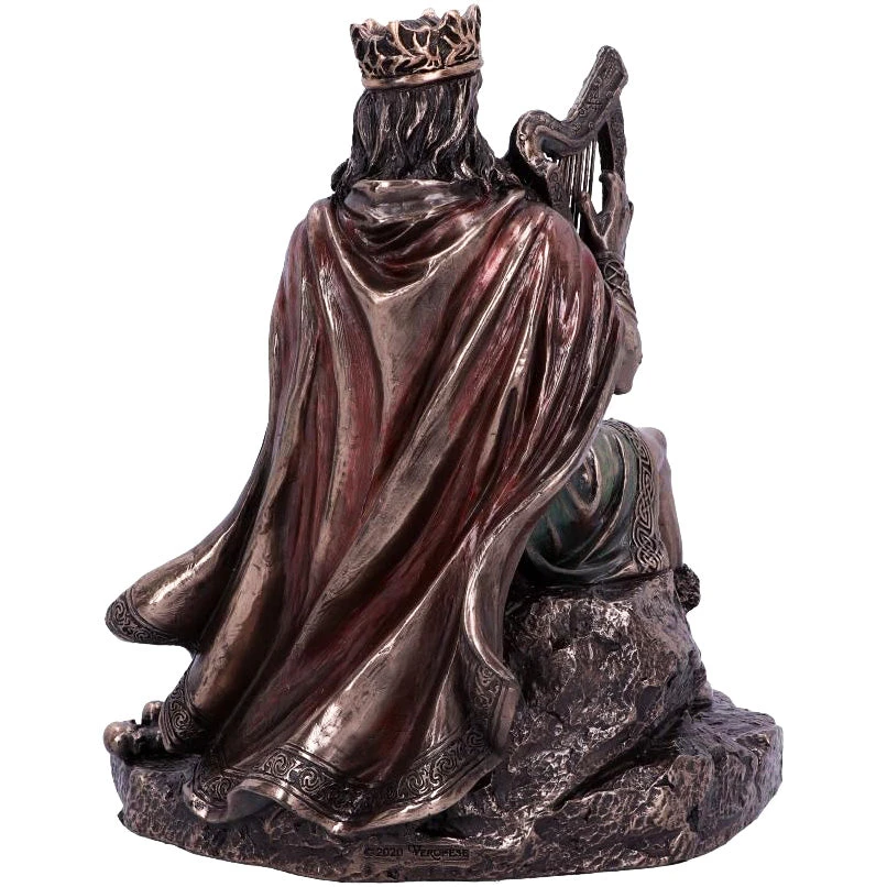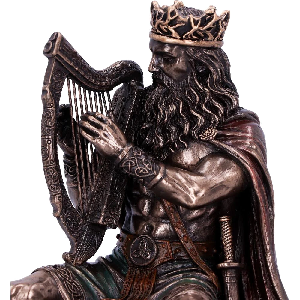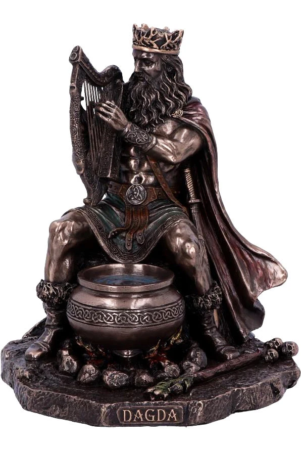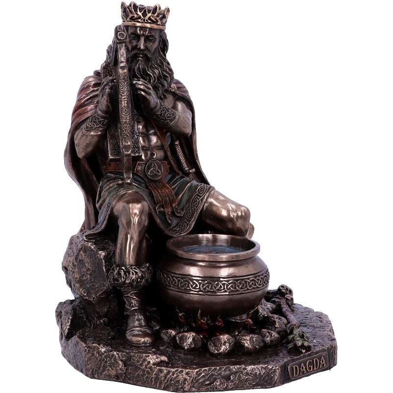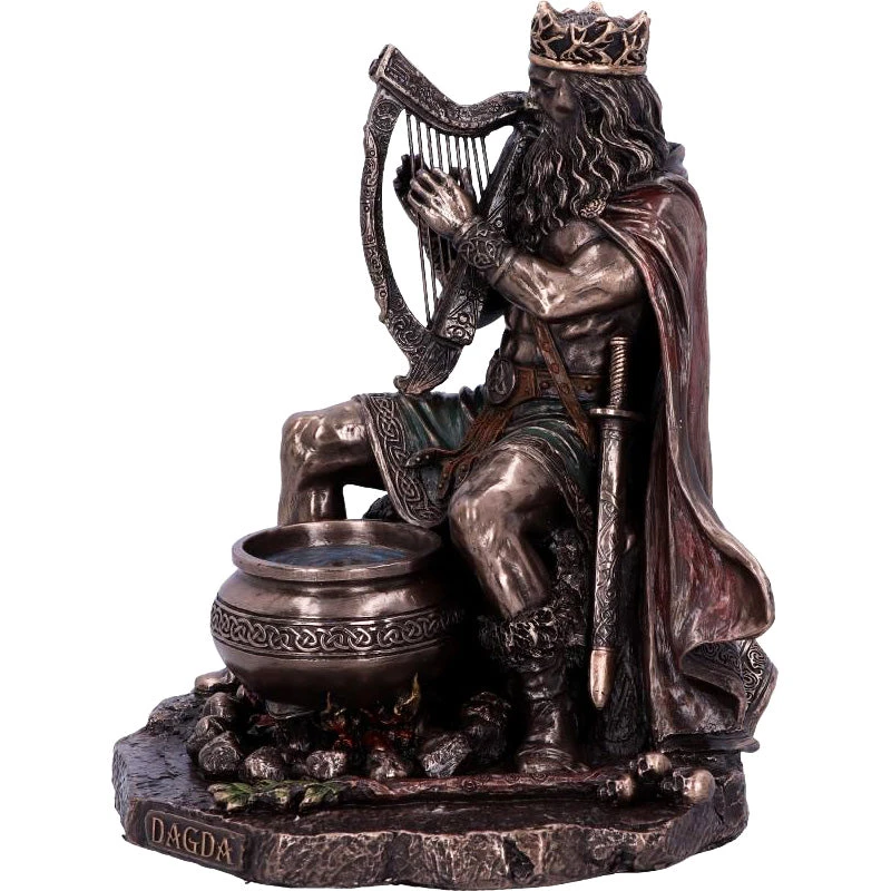 The Dagda, or “good god,” was a Celtic deity and the club-wielding chief of the Irish Tuatha dé Danann. Highly skilled and wise beyond measure, he was associated with fertility, agriculture, life, and death. He wielded three sacred treasures: a cauldron of plenty, a club of life and death, and a harp that controlled men and seasons alike, all of which can be seen in this image. Cast in the finest resin before being given a bronzed finish.