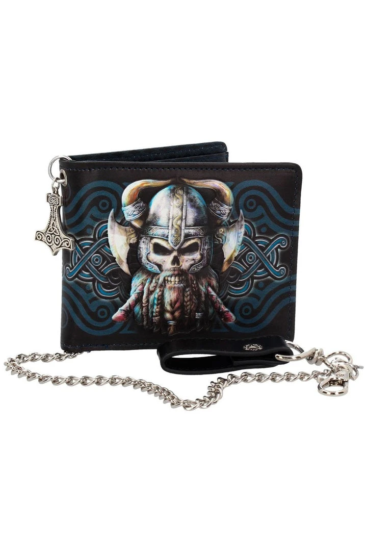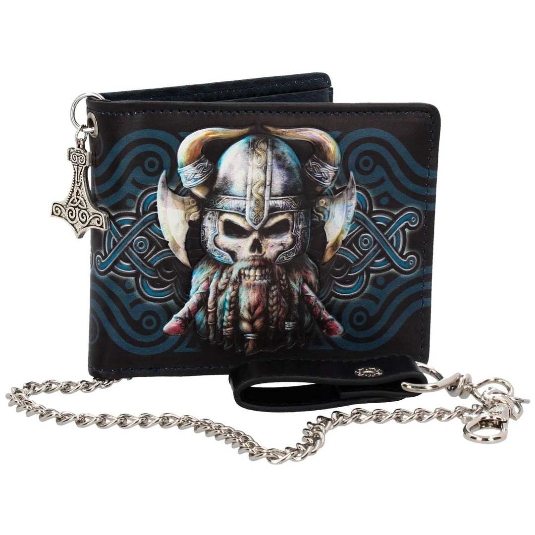 Claim your rightful tribute with the Danegeld Wallet. On a background of blue intertwined knots, a bearded Viking skull stares outwards, battle-axes crossed behind them. Their horned helmet is embellished with geometric designs, ready for battle. Perfect for keeping your money safe when you’re out with the Viking marauders.