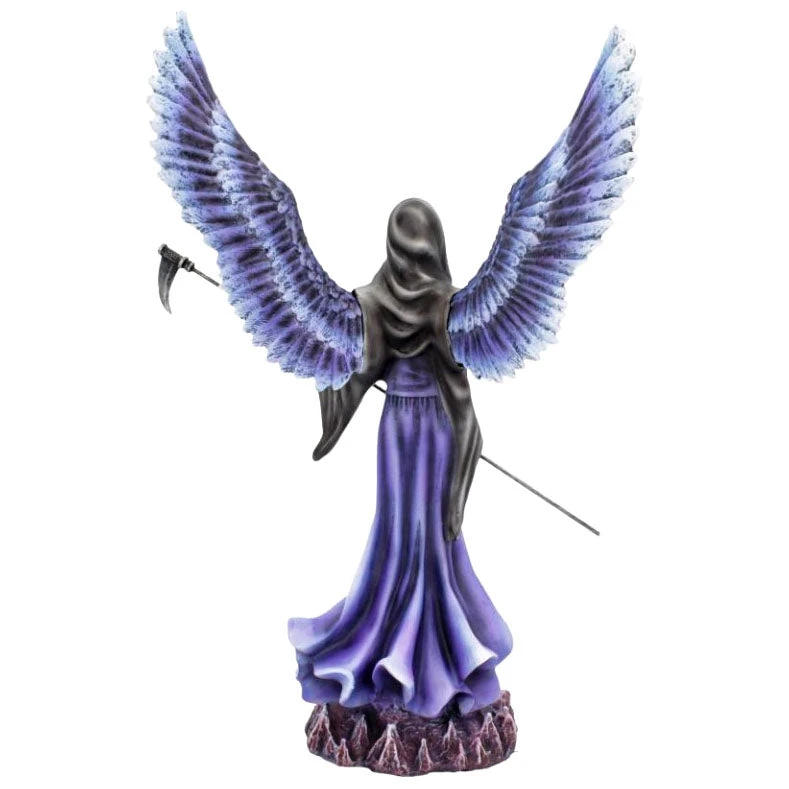 Standing proudly, this Fairy’s long purple dress flows down to the rocky floor, her thigh emerging at the front. A dark hood covers her eyes as her long white hair cascades down her chest. Her aubergine wings stretch out behind her, as she grasps a scythe in her hands. Cast in the finest resin before being carefully hand-painted, this statuette is fitting for any lover of the macabre.