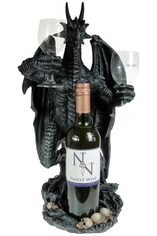 This colossal black Dragon stands on the skeletal remains of all his victims, luring them in with his finest vintage. His long claws grasp a pair of wine glasses, while your favourite vino can be placed in a small circular crevice on the base. Cast in the finest resin before being expertly hand-painted, this mythical beast is the perfect statement piece in any home.