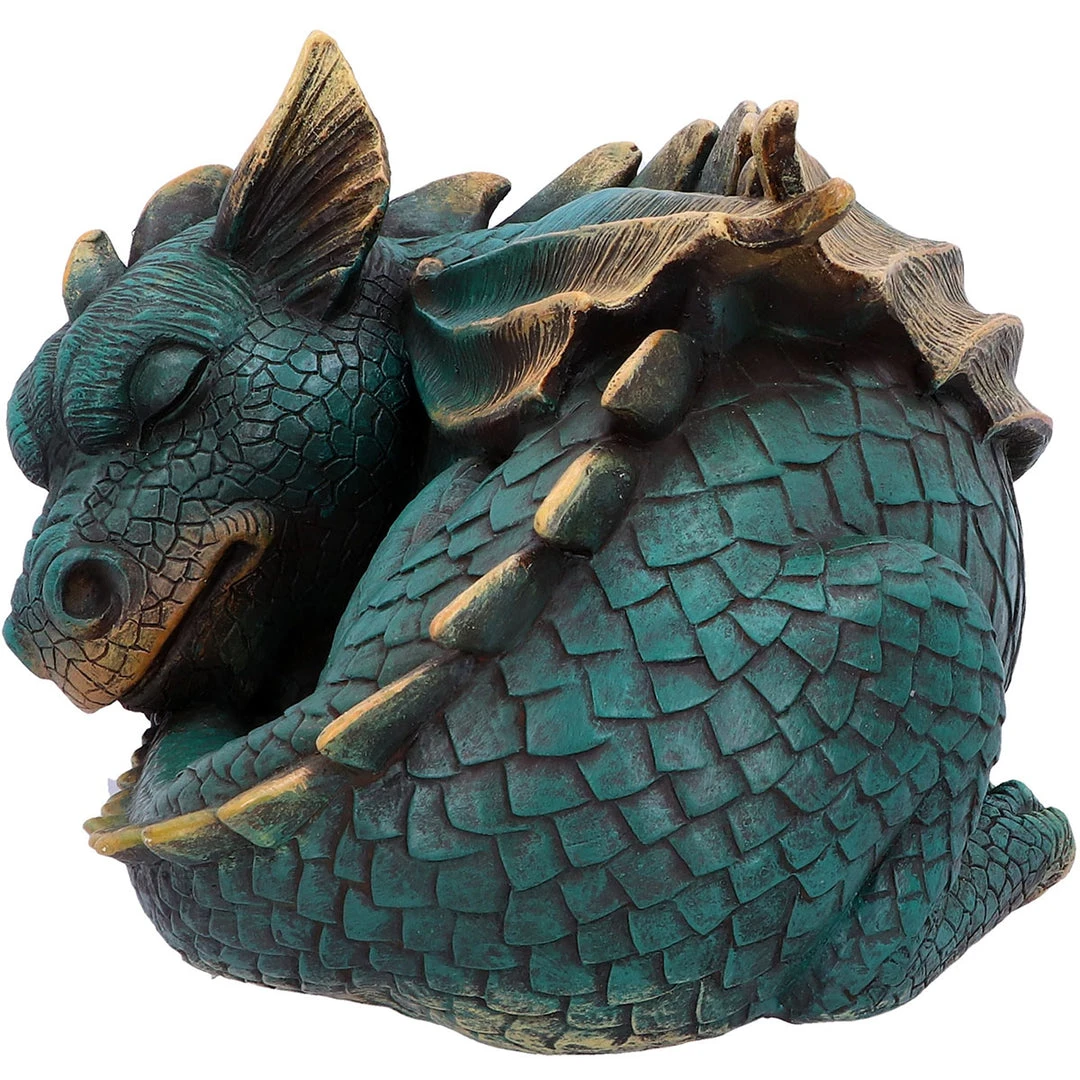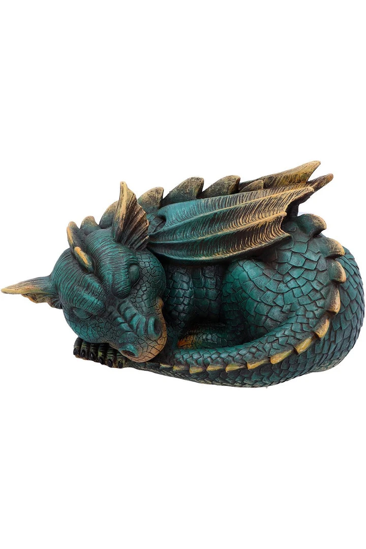 This dozing Dragon makes the perfect addition to any home! Laying down on the ground, this Emerald Dragon has his front legs tucked under his restless head, forming a cosy pillow. His wings lie relaxed on his sides as his back legs curl under his large tail. Eyes firmly closed this resting Dragon has safely drifted into the dream world. Cast in the finest resin before being lovingly hand-painted, this enchantingly adorable Dragon is the ideal gift for any lover of mythical beasts.