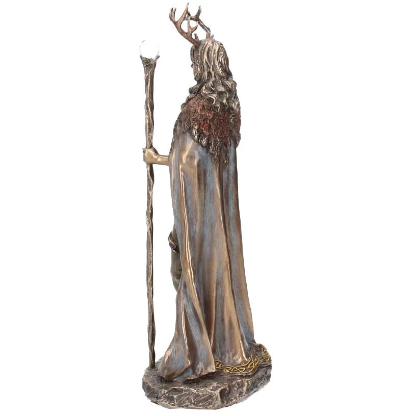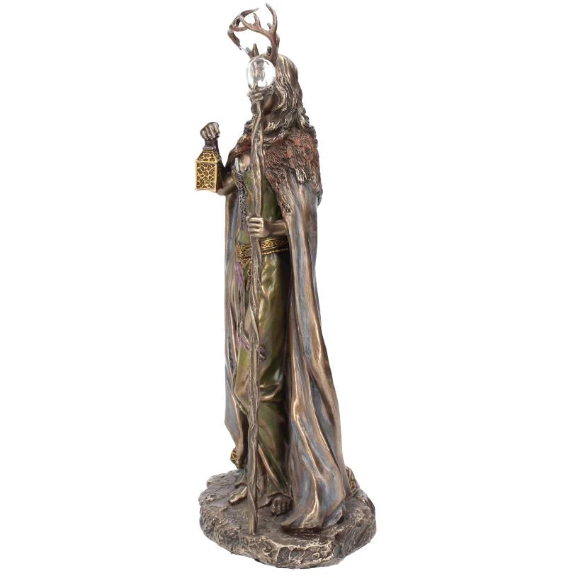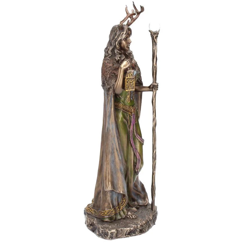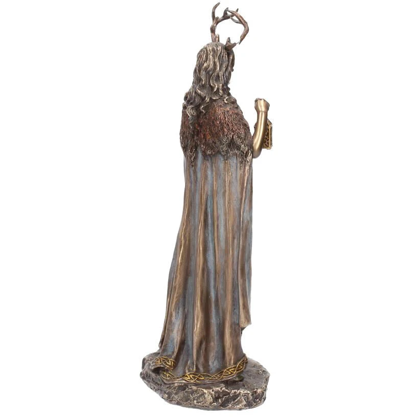 Cast in the finest resin before being given a bronzed finish. This Keeper of The Forest figurine depicts Elen of the ways, the antlered goddess who is the guardian of the leys, the ancient trackways. This female pagan deity is unique in that she is the only horned goddess, wearing the antlers of the female reindeer. She is seen by many as a female equivalent of the Green man and Cernunnos, or a consort to Herne the hunter, and would make the perfect addition to any home.