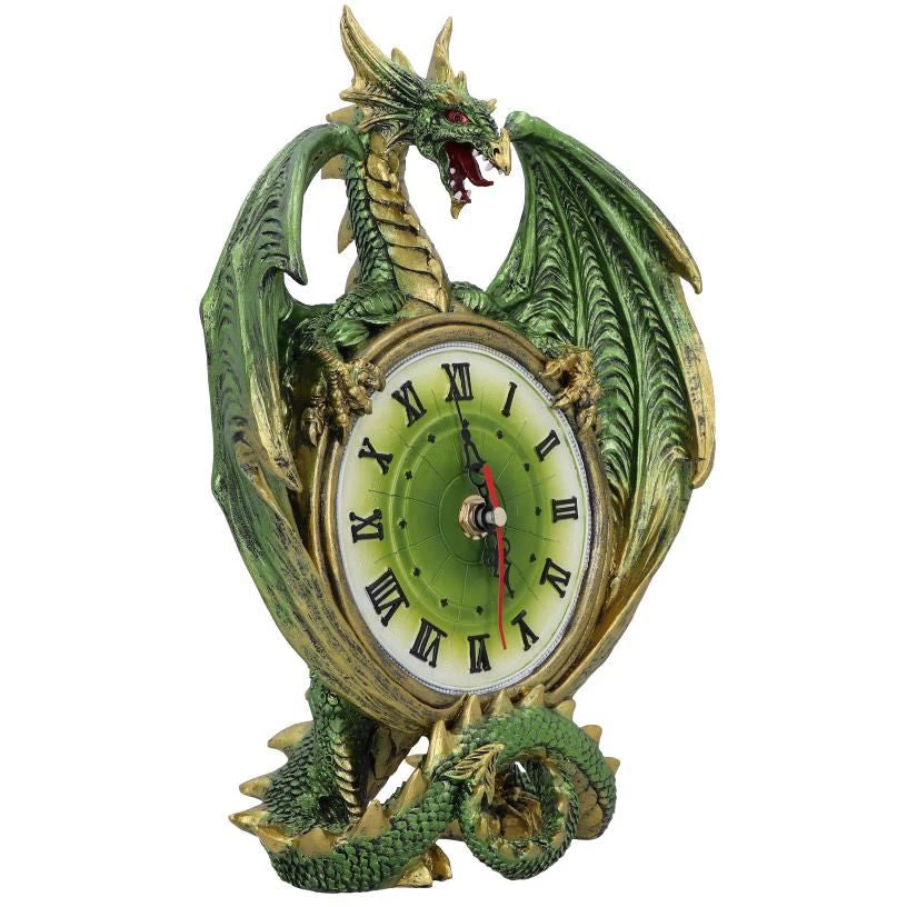 Take control of your time with this fantastic wall clock. This clock is guarded jealously by an Emerald Dragon, featuring gold highlighted underbelly, talons and tail spikes. Talons curled around the clock possessively, his wings are raised in a threat display. Cast in high-quality resin before being painstakingly hand-painted, this majestic clock can adorn any wall.