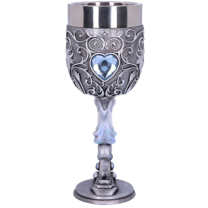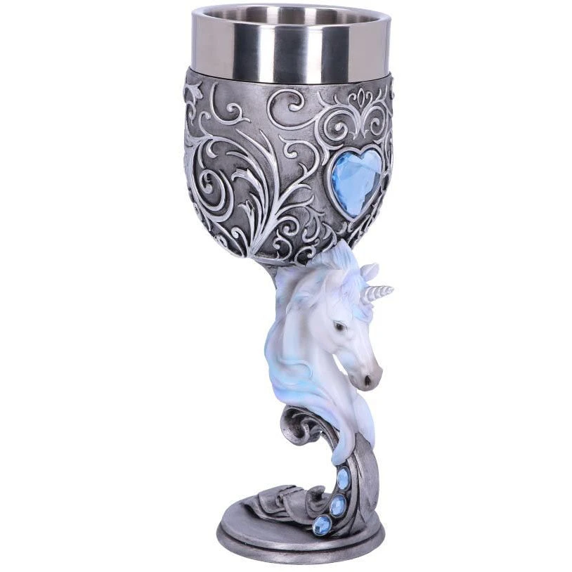 “When I look into your eyes, I see the promise of love” Adorned with intricate silver baroque detailing rising from the metallic base to the stainless-steel rim, this Goblet is the perfect addition to any fantasy collection. At the centre of the carefully sculpted stem is the head of a white Unicorn protruding outwards. Above it is an icy blue gemstone crafted into a traditional heart shape. Cast in high-quality resin and carefully hand-painted these Enchanted Hearts goblets can be paired together to form the shape of a heart, perfect for sharing with your mystic love.