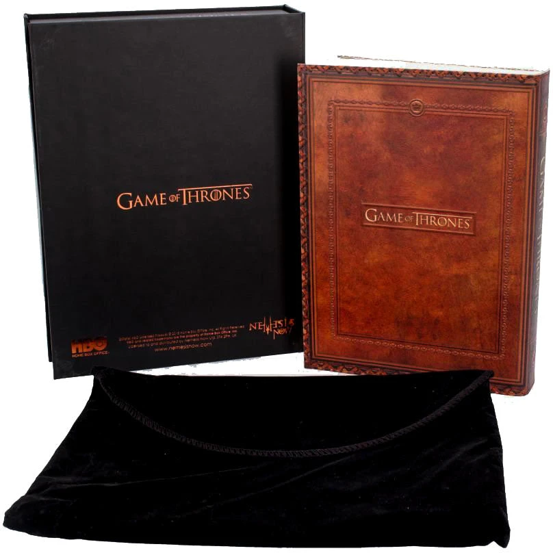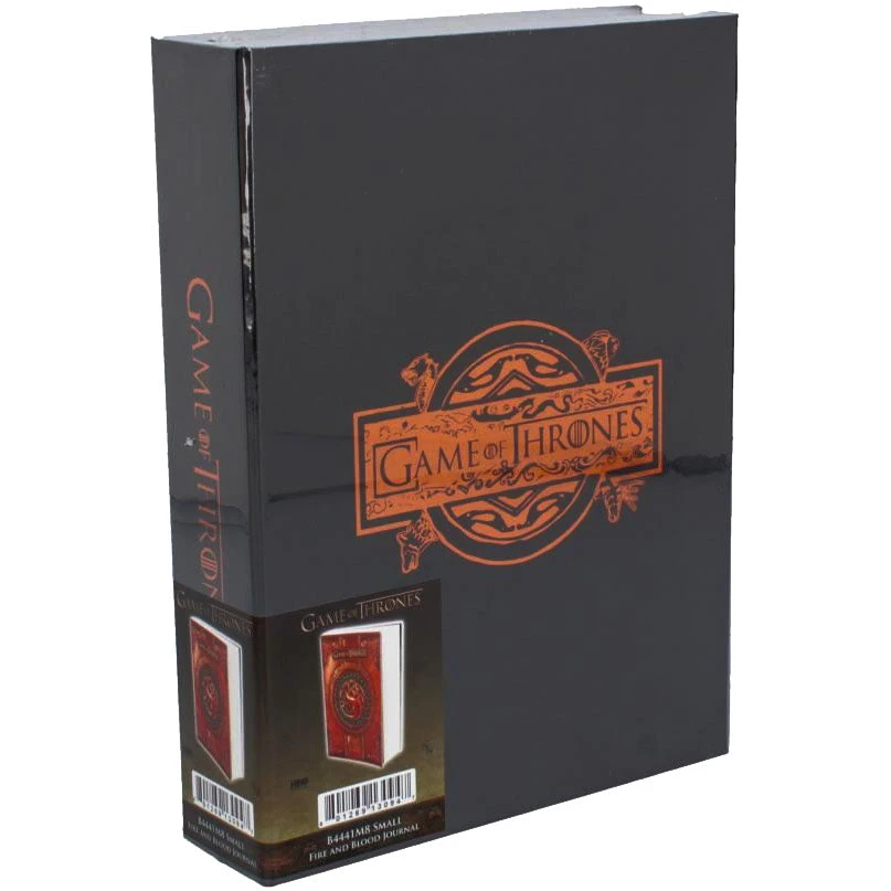 On an ornate red back ground sits a studded grey shield with the Targaryen’s house Sigil. A flame red, three-headed Dragon forms the centre-piece of this journal and to further show your support for the Targaryen family the writing along the bottom reads ‘Fire and Blood’, their motto. Inside the front and back covers there is a copy of the Westeros map, printed on the same high-quality paper that can be found throughout the journal. This stunning piece will arrive to your customer in a fabric sleeve protected by a black and copper decorative presentation box, adding to its sophisticated look.