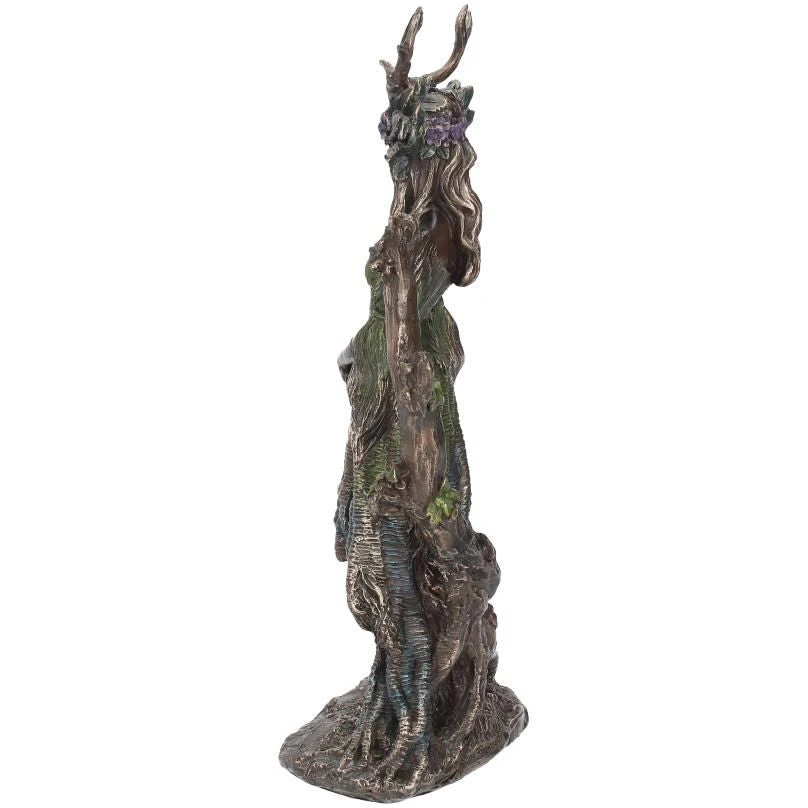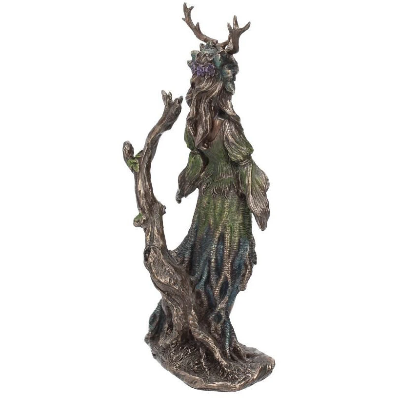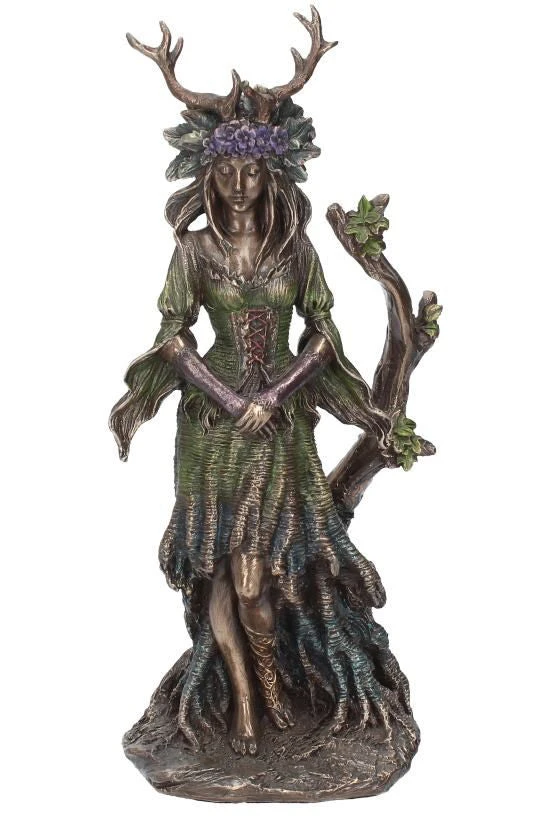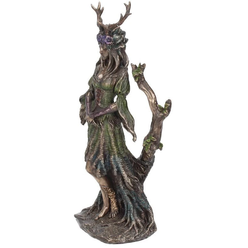 Cast in the finest resin before being given a bronzed finish. The Lady of the Forest, Flidais or Celtic Earth Goddess figurine represents many different stories and aspects of the Earth Mother. She is the Goddess of Sensuality and Sexuality, Goddess of abundance and as Flidais, has the ability to shape shift. The Lady of the forest is dressed in a skirt that appears to be part of the earth itself by flowing from her waist down as roots into the ground; the laced bodice seems alive and grows organically around her. On her head, she wears a crown of woodland flowers and leaves topped by the horns of one of her sacred animals – the deer.
