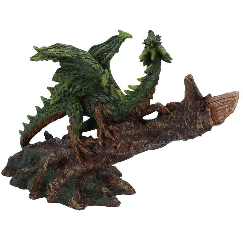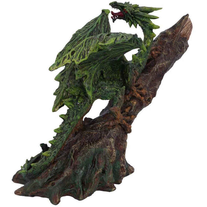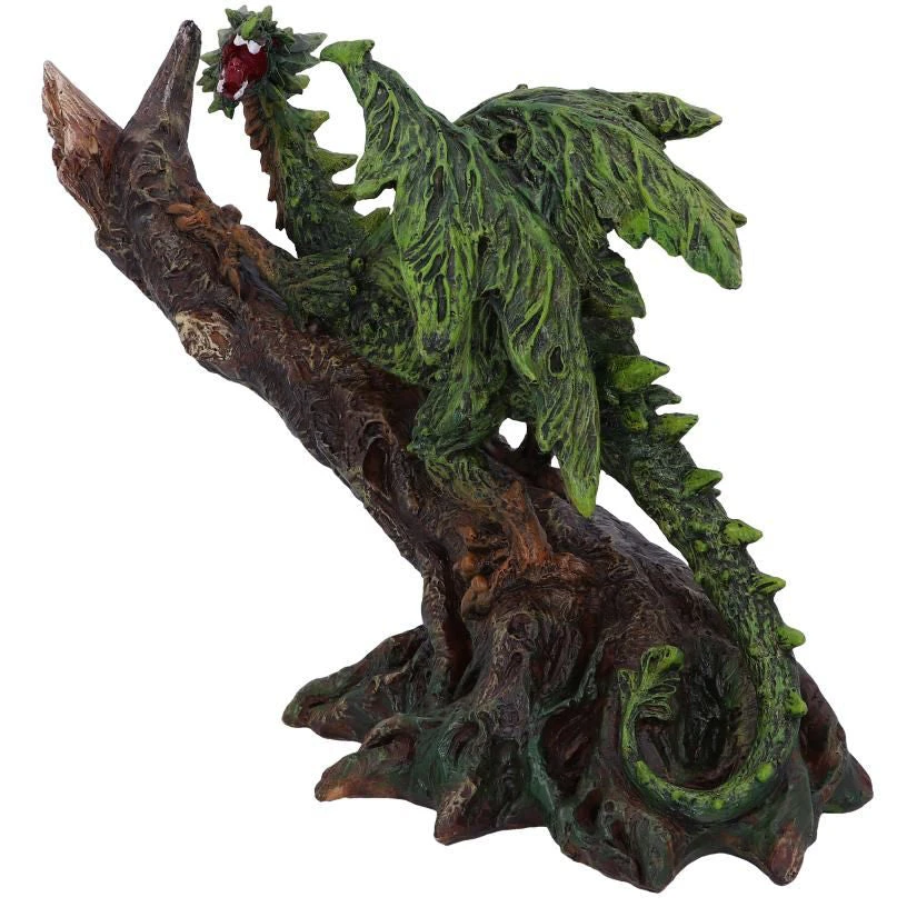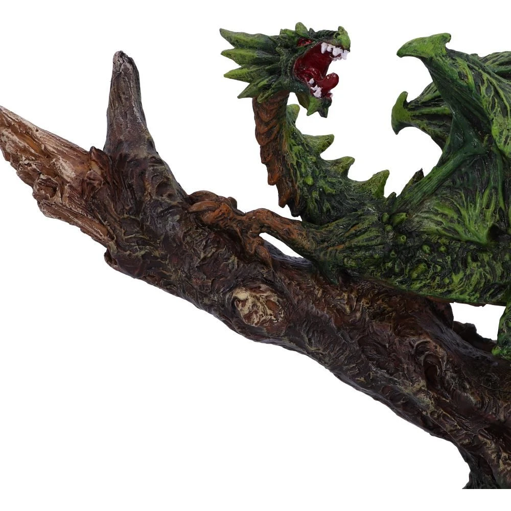 Forest Freedom rests on his large tree trunk perch. Deep Green in colour, this dragon has dark brown lowlights on his underbelly and clawed feet. He is at one with the forest and can easily camouflage in any dense woodland areas. Cast in the finest resin before being hand-painted, this monstrous piece will look perfect in any dragon enthusiasts collection.
