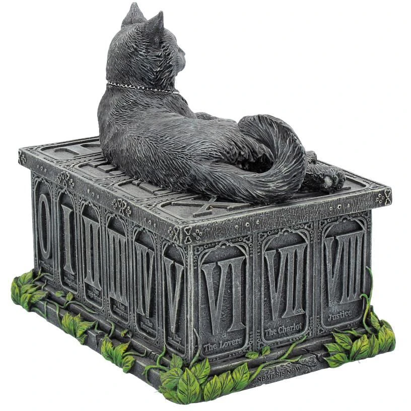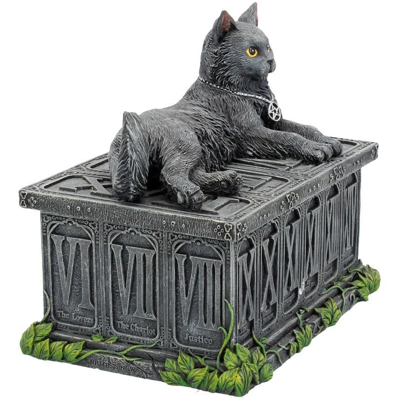 Looking like a lost stone altar deep in the forest – pitted with lichen at the top as tendrils of ivy creep around the bottom – the box has numbers circling the outside, naming the major arcana of the tarot deck in order. Counting from The Fool to The Star, the remaining arcana are on top, but obscured by a reclining cat. Black and furry, with a silver pentacle hanging from its neck, it looks up with a preternatural intelligence and curiosity. Within the box, a few autumn leaves lie scattered over an engraving of the four tarot suites – Pentacles, Rods, Swords and Cups. This piece is the perfect gift for the mystic seeker of knowledge in your life – even if that person is yourself. Store your most trusted tarot deck in safety and style.