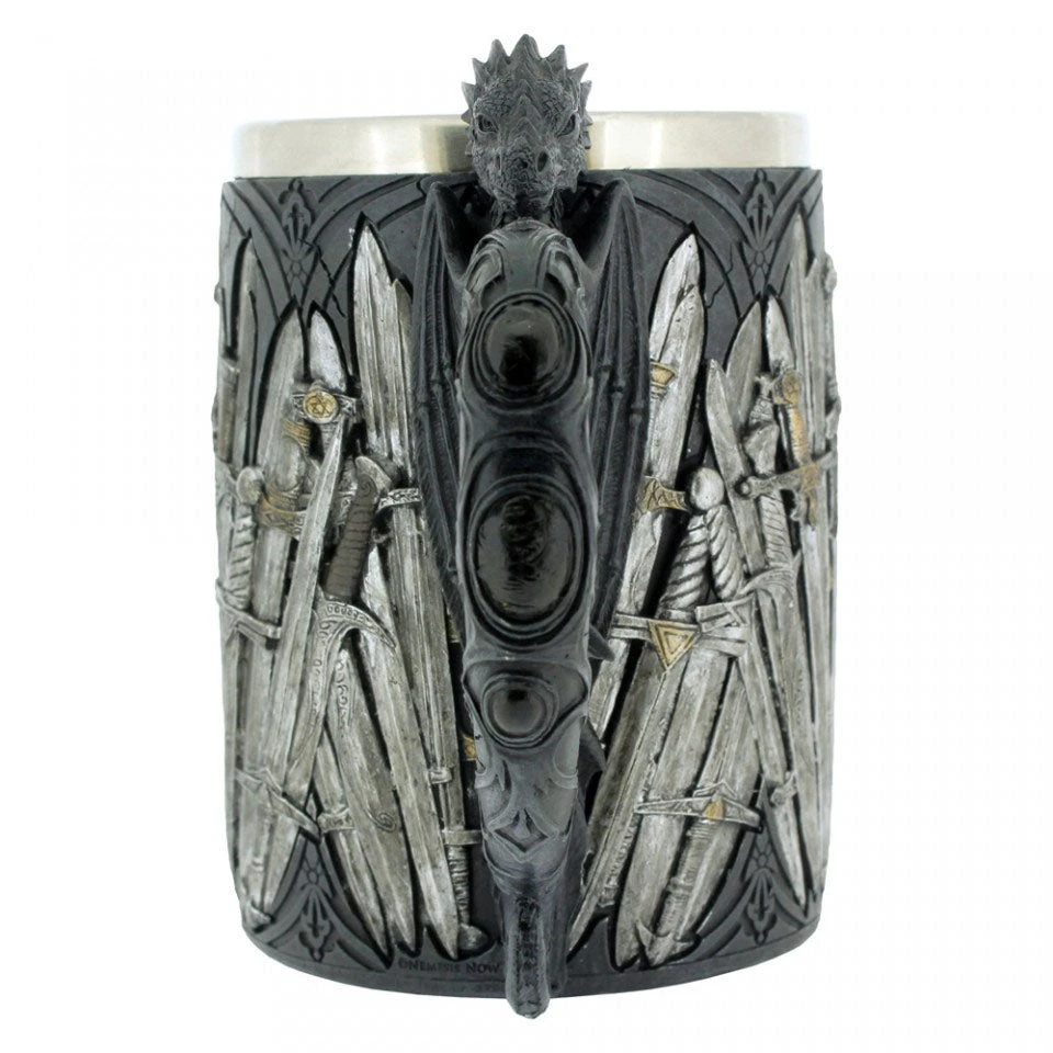 Curving gently outwards, the black handle has the appearance of a dragon arching outwards, wings flat against the tankard and curled celtic designs down the tail. The body of the tankard is emblazoned with a multitude of swords on a black background. Cast in the finest resin before being painstakingly hand-painted, this tankard comes with a removable stainless steel insert for ease of cleaning. Fill with your favourite wine or mead and let your enemies know you’re not to be trifled with.