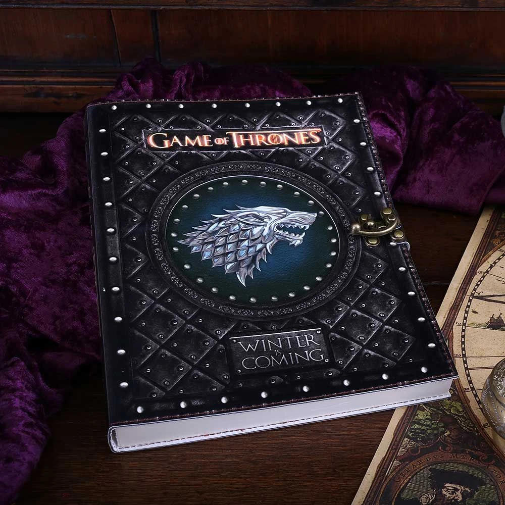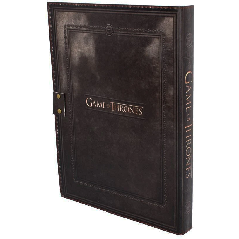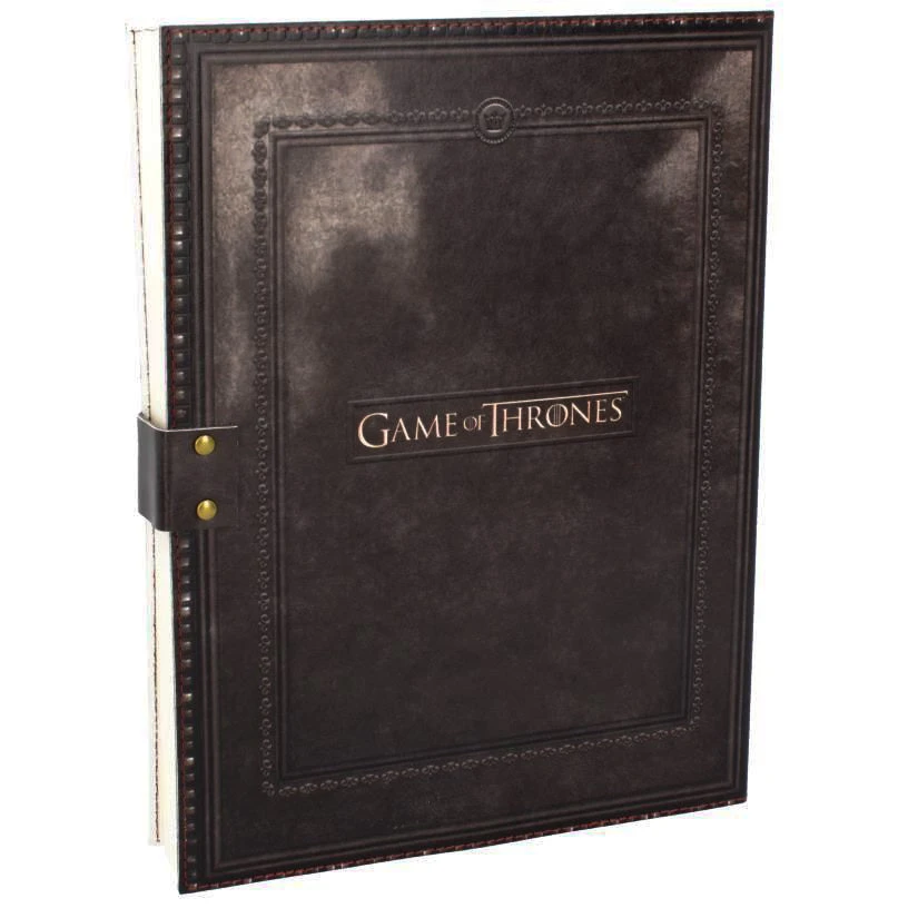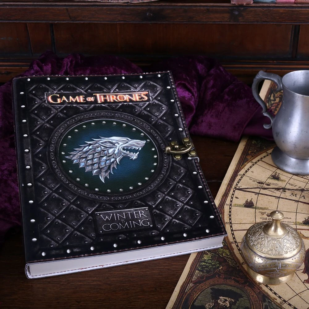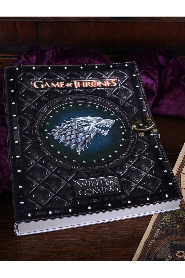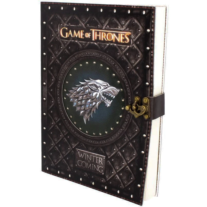 On a dark grey studded back ground, the Direwolf is the main focus of this hand-crafted piece. Representing the House of Stark, the plaque at the bottom reads Winter is Coming the families most iconic motto. Inside the front and back covers there is a copy of the Westeros map, printed on the same high-quality paper that can be found throughout the journal. Adding to the high-quality finish, this journal can be sealed shut, using the bronzed lock on the right-hand side. This stunning piece will arrive in a fabric sleeve protected by a black and copper decorative presentation box, adding to its sophisticated look.
