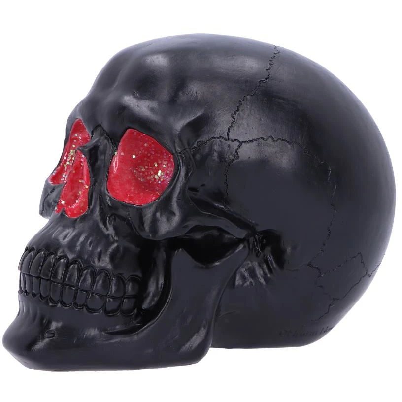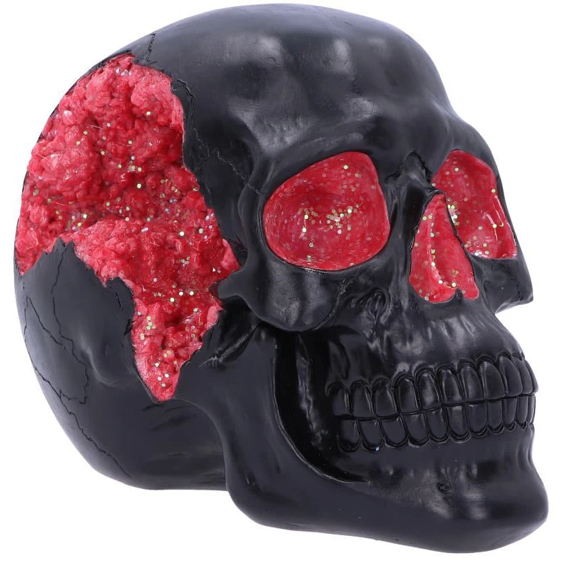 Red Geode Skull: The most unassuming façade can hide the most scintillating interior. This matte black skull has eyes and nose holes that open up to a sparkling red world. A large crack at the side of the skull reveals an enchanting red crystal geode within, sparkling in the light. Cast in high-quality resin before being lovingly hand-painted, this skull makes a magical addition to any shelf.