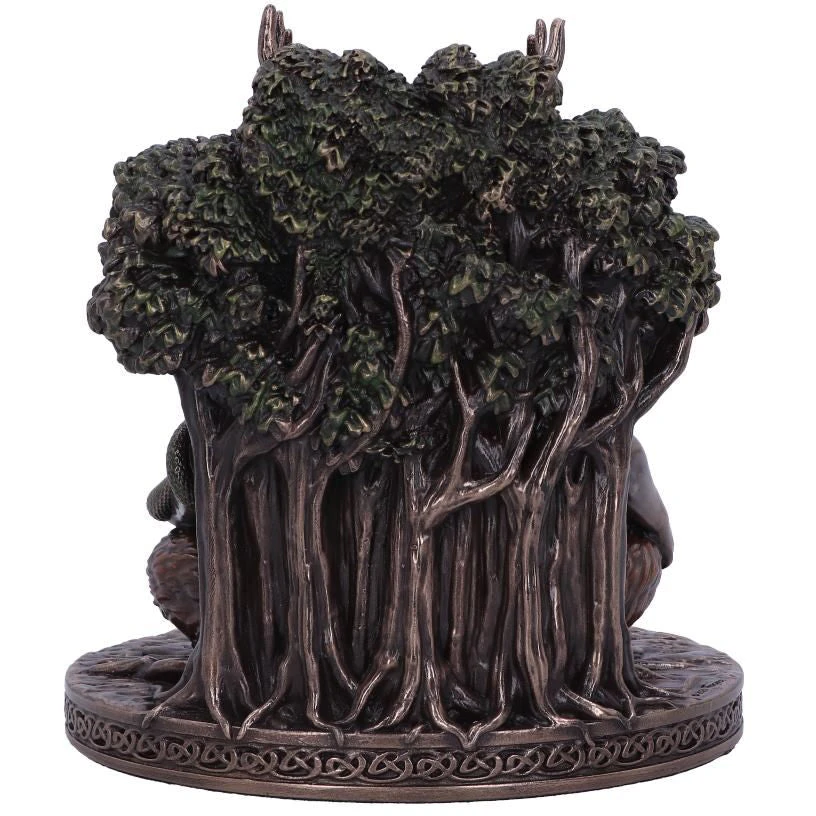 This magnificent figurine is cast in the finest resin before being given a bronze finish and expertly hand-painted. Cernunnos sits crossed legged against a tree stump, his muscular torso exposed, majestic antlers sitting high on top of his long hair, and a green snake wrapped around his arm. This fantastic Celtic figurine is perfect as a centrepiece for any alter or coffee table.