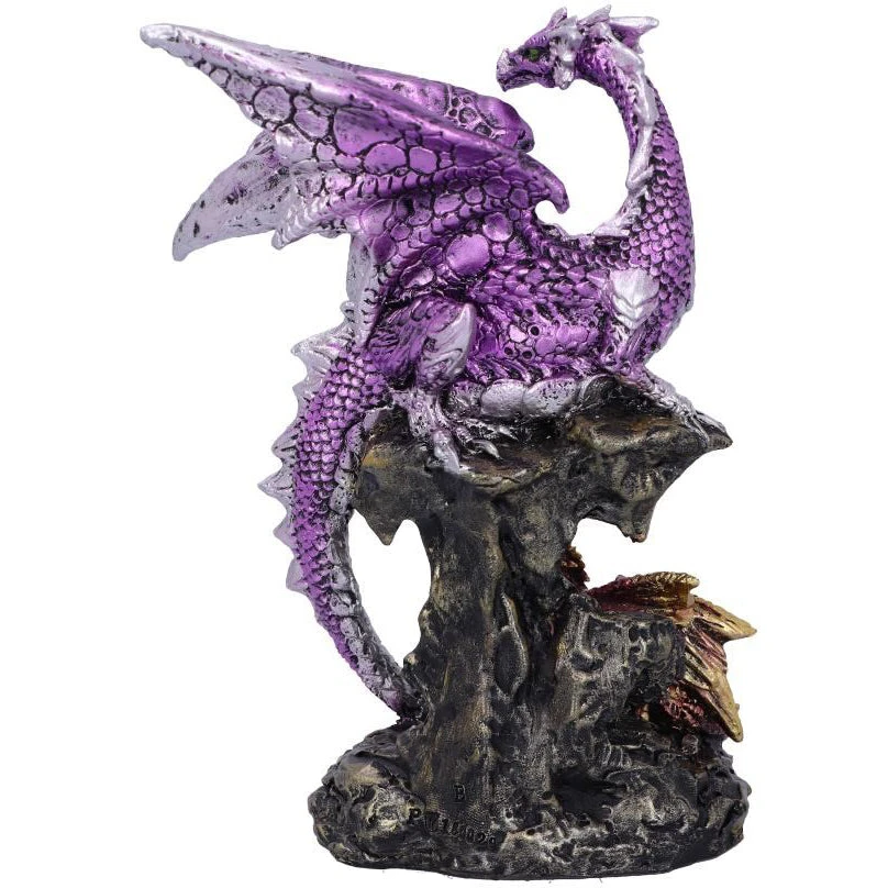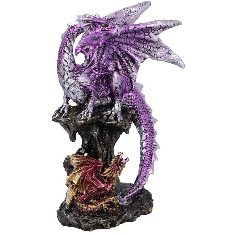 This Amethyst Dragon lovingly looks down at her hatchling. Balancing on a small rock formation, this matriarchal Dragon clings, wings spread behind her as if ready to intercept any intruders. At the base of the rocks a small Dragonling sits, staring inquisitively. The large Dragons tail cascades over the side of the stack and rests just below her Dragon offspring. Cast in the finest resin before being lovingly hand-painted, this enchanting piece would look great in anyone’s Fantasy collection.