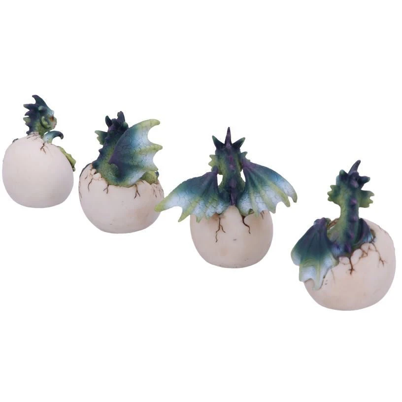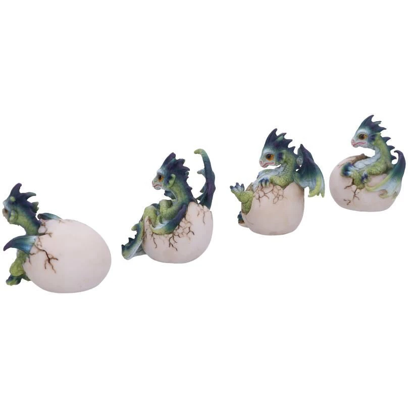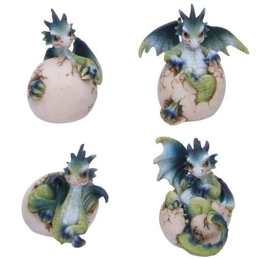 Watch as this quartet of cautious creatures emerge from their shells into this unfamiliar world. These wide-eyed dragon hatchlings emerge from their shells in unique ways, each struggling to find their way out. The dragons have bright-green scales with dark-blue accents on their claws, horns and wings. Cast in the finest resin before being lovingly hand-painted, this enchantingly adorable Dragon set is the ideal gift for any lover of mythical beasts!