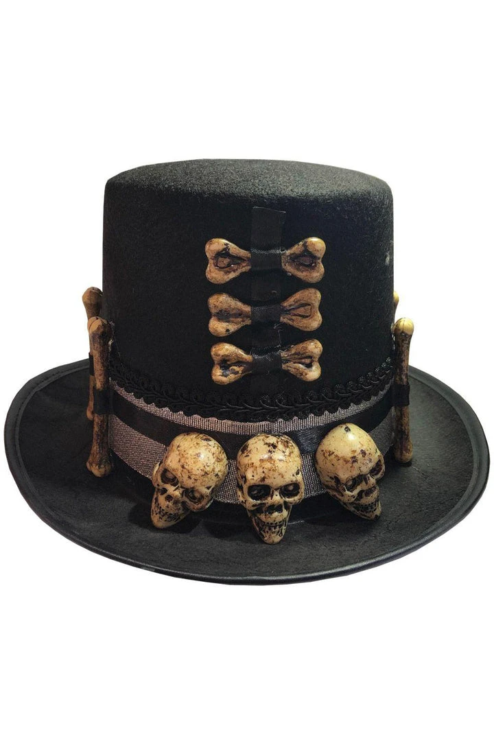 Voodoo Priest’s Hat: This decorated top hat is worn by practising voodoo priests when summoning spirits during rituals Formed from a simple black top hat, this stylish piece features three natural coloured skulls at the centre, surrounding them at the front and the sides are 3 sets of 3 bones. Finished with neat grey ribbon and knotted black trim this top hat would be a great finishing article to any macabre fancy dress.