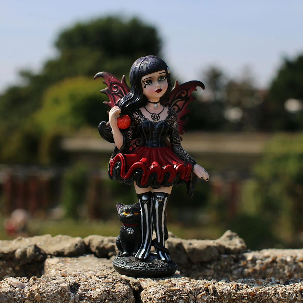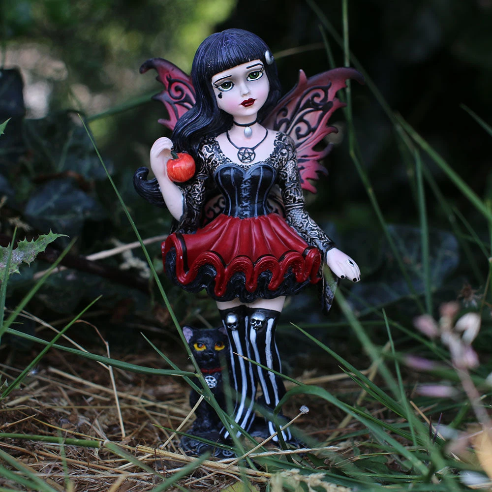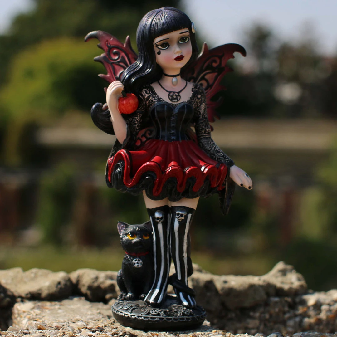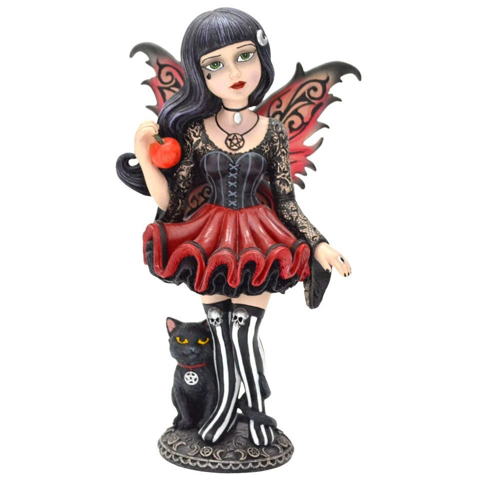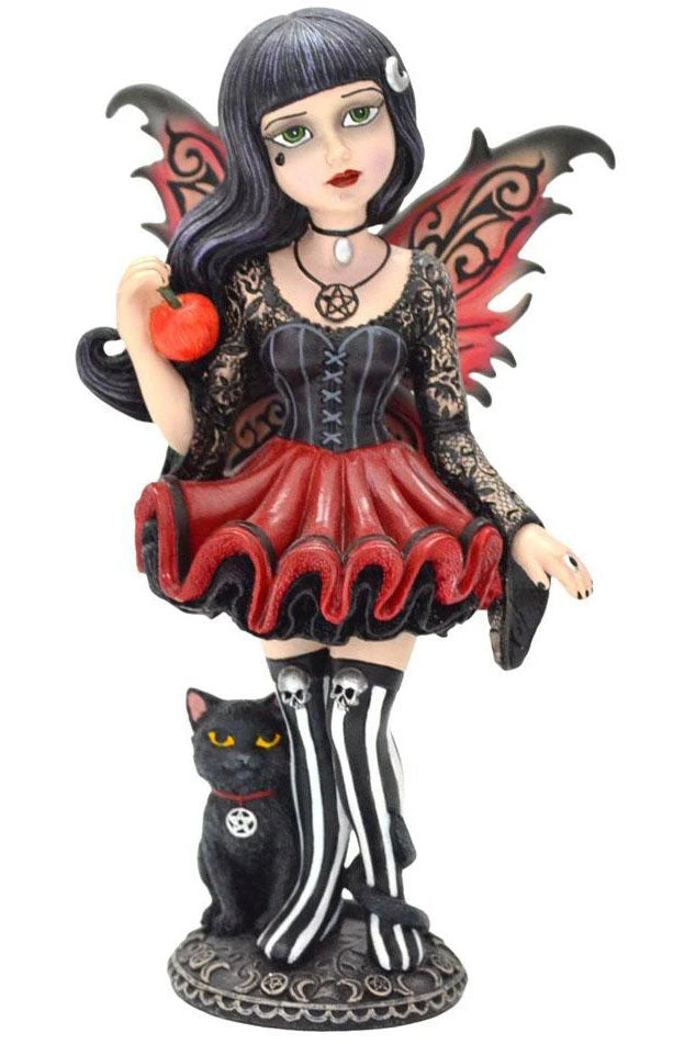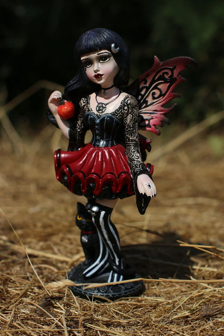 Her unfurled wings the colour of autumn leaves, this young Fairy wears a red dress that flares out to show the black ruffles underneath. Her corset-style top has long, lacy sleeves that hang down at the wrists, and her thigh-high black and white striped boots are topped with silver skulls. Around her neck, she wears a pentagram pendant and a small choker, and at her feet a black cat with a matching pendant looks up with unnatural intelligence, its long tail curling around one of her legs. In her right hand, she casually holds a juicy red apple. Her long black hair flows in the wind, adorned only by a silver lunar crescent, as she looks at you calmly, her green eyes inviting you to share in the forbidden fruit. The base of the figurine is circled by crescent moons and pentagrams. Hand-painted after being cast in the finest resin, this statuette is the perfect gift for those who feel tempted by forbidden fruit.