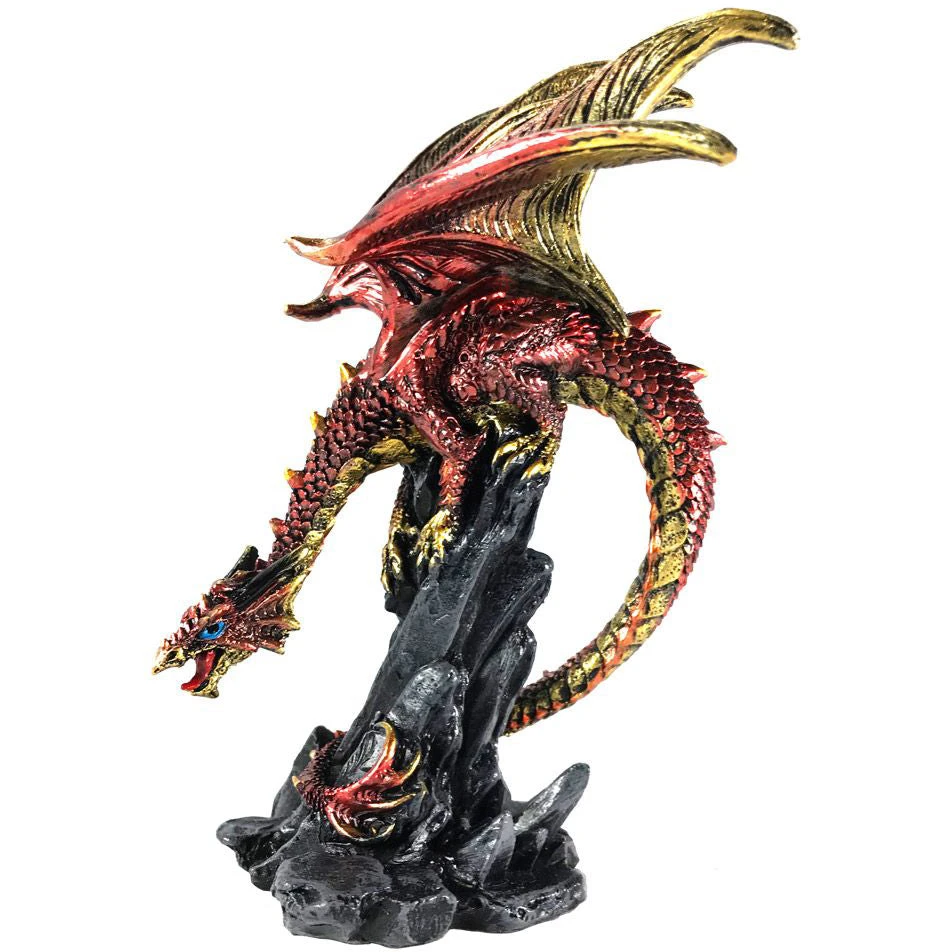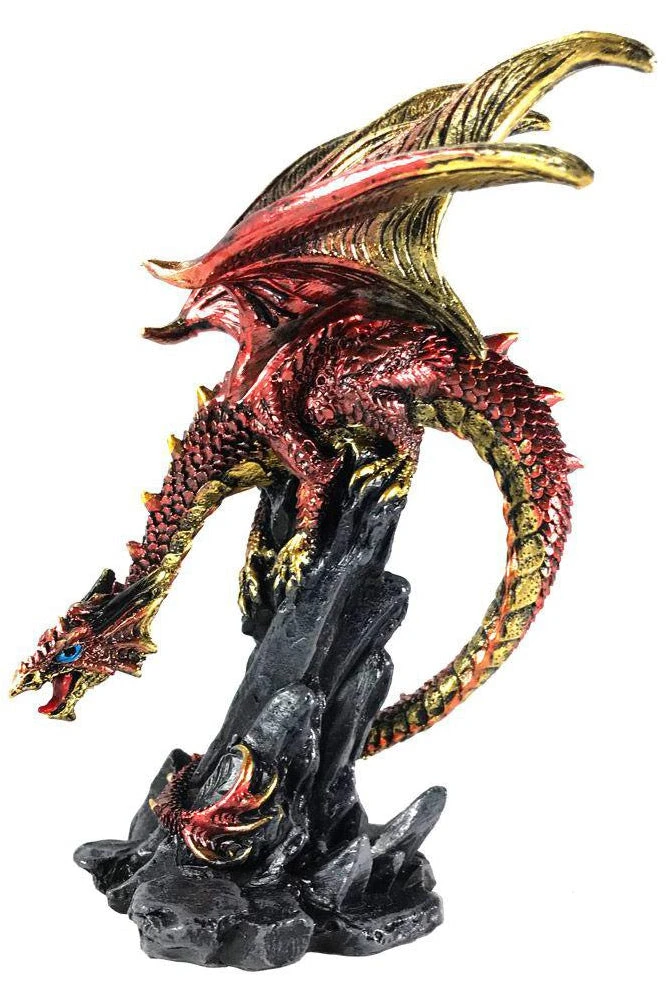 This ruby-red dragon whelp struggles to find its feet on a small grey rock crag as it prepares to let out its first fearsome roar to make itself known to all other creatures nearby. The young dragon has gold accents on its claws, wings and horns. Cast in the finest resin before being hand-painted, this endearing piece will look perfect in any dragon enthusiasts collection.