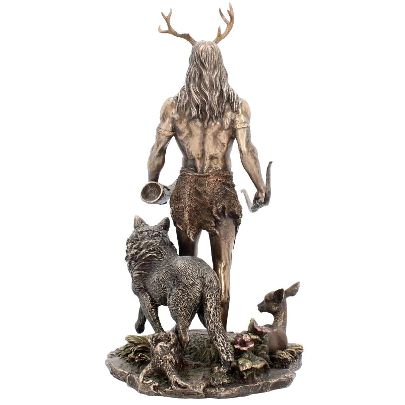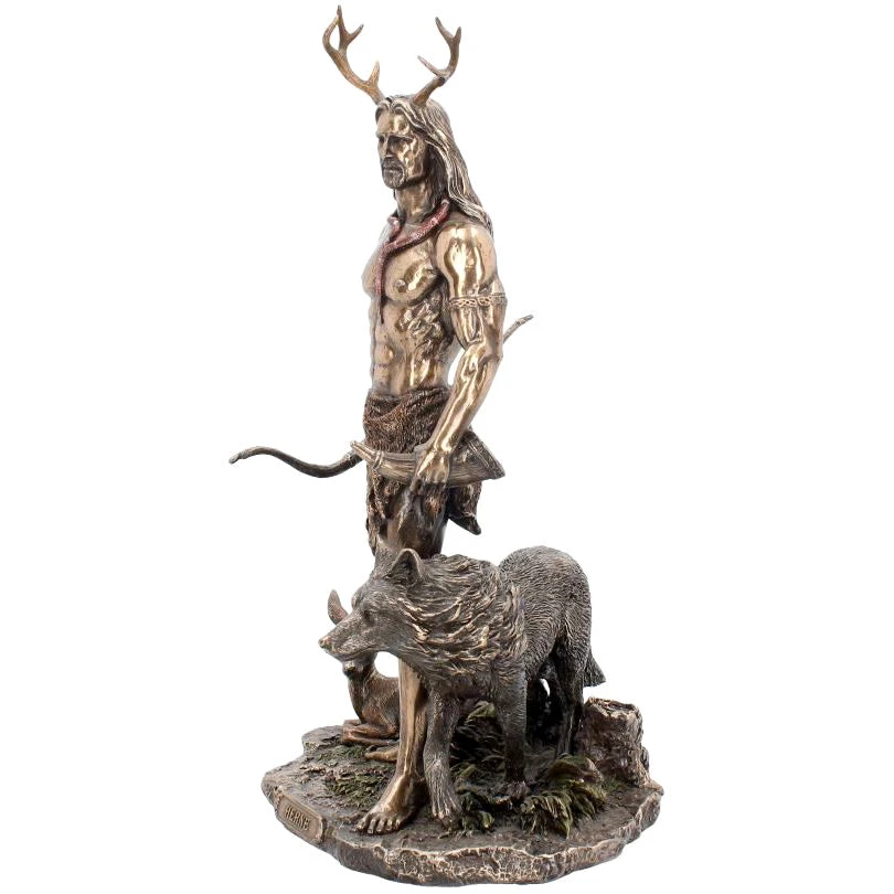 This alternative Celtic figurine is cast in the finest resin before being given a bronze finish and painstakingly hand-painted. Standing proudly in the forest, Herne, God of the Hunt looks around, a short bow in his right hand, a hunting horn in his left. He wears only a fur wrapped around his waist to protect his modesty. A red snake slithers around his neck below his shoulder-length hair, and large antlers emerge from his head. At his feet, a wolf prowls, ready to join the hunt, while a faun sits and looks unafraid. Perfect for the centrepiece of any altar, this mythological figurine is a perfect gift for those who want to know what to expect in Windsor Forest.