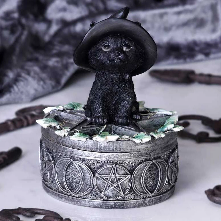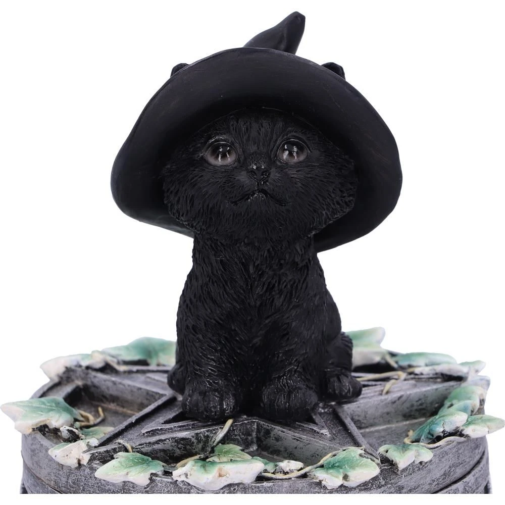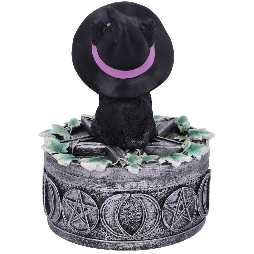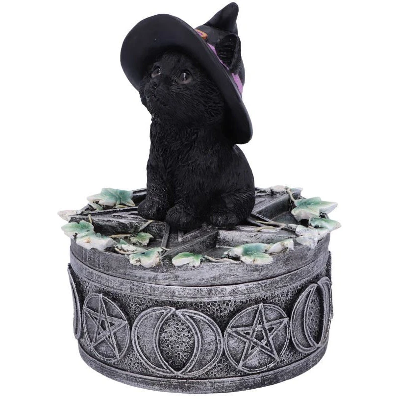 Sat on top of this box a small black cat sits looking longingly at onlookers waiting to be taken home. With a witches hat on its head, this cat fits the theme of the box which has been covered in Wicca symbols and ivy leaves. The perfect piece for keeping your most prized possessions safe. Cast in the finest resin before being carefully hand-painted, this familiar box is the perfect addition to any feline fanatics collection.