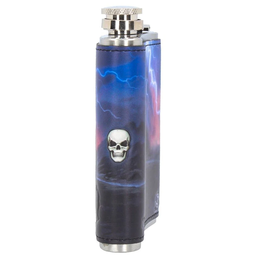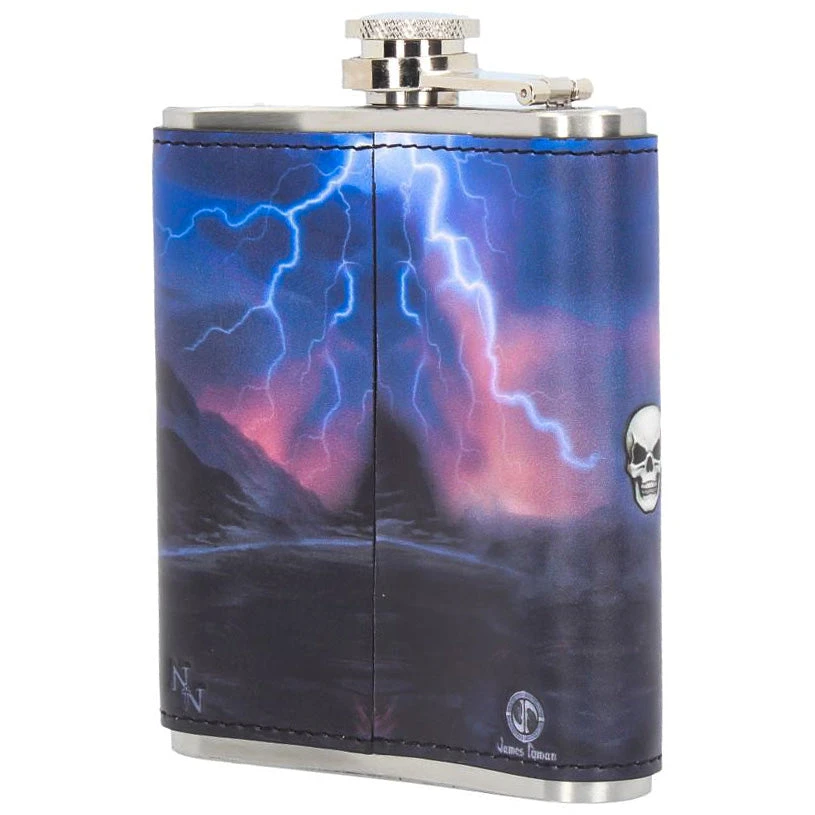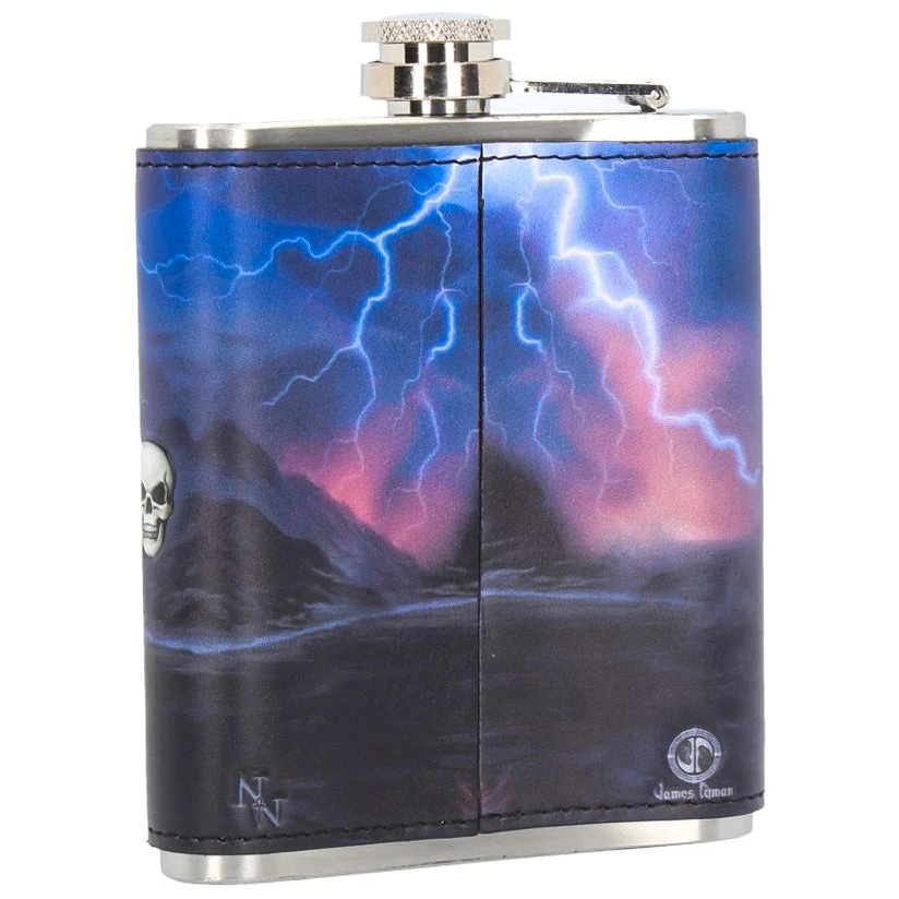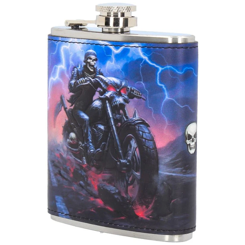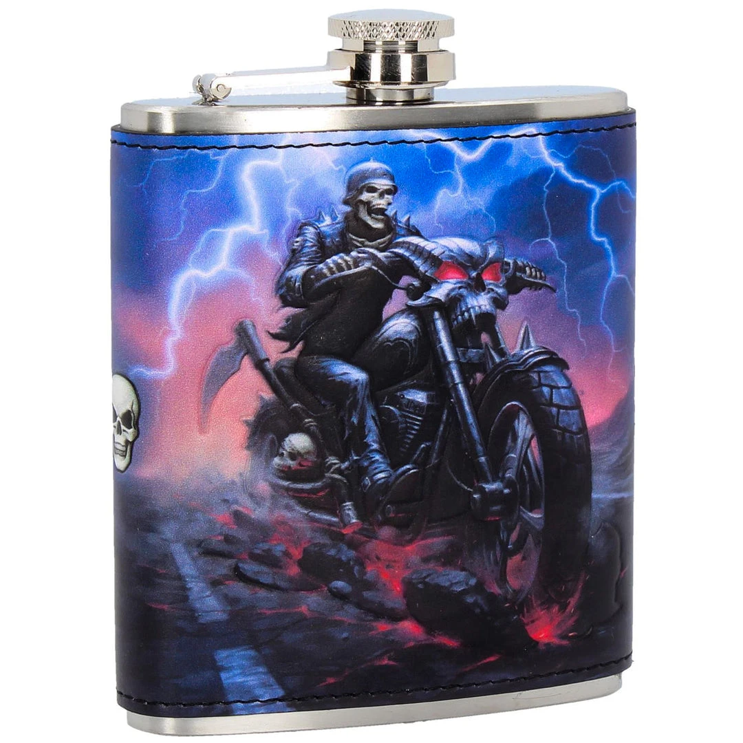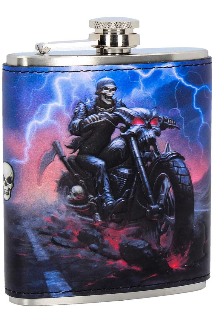 Keep out the cold with this fantastic alternative hipflask by world-famous gothic and alternative artist James Ryman. Riding hard enough to tear up the road, this hellish biker has their scythe lashed to the side of their bike. Lightening arcs across the sky behind them, the glow of fire in the distance. Perfect for keeping a discreet nip on you when drinking with bikers from beyond the grave.