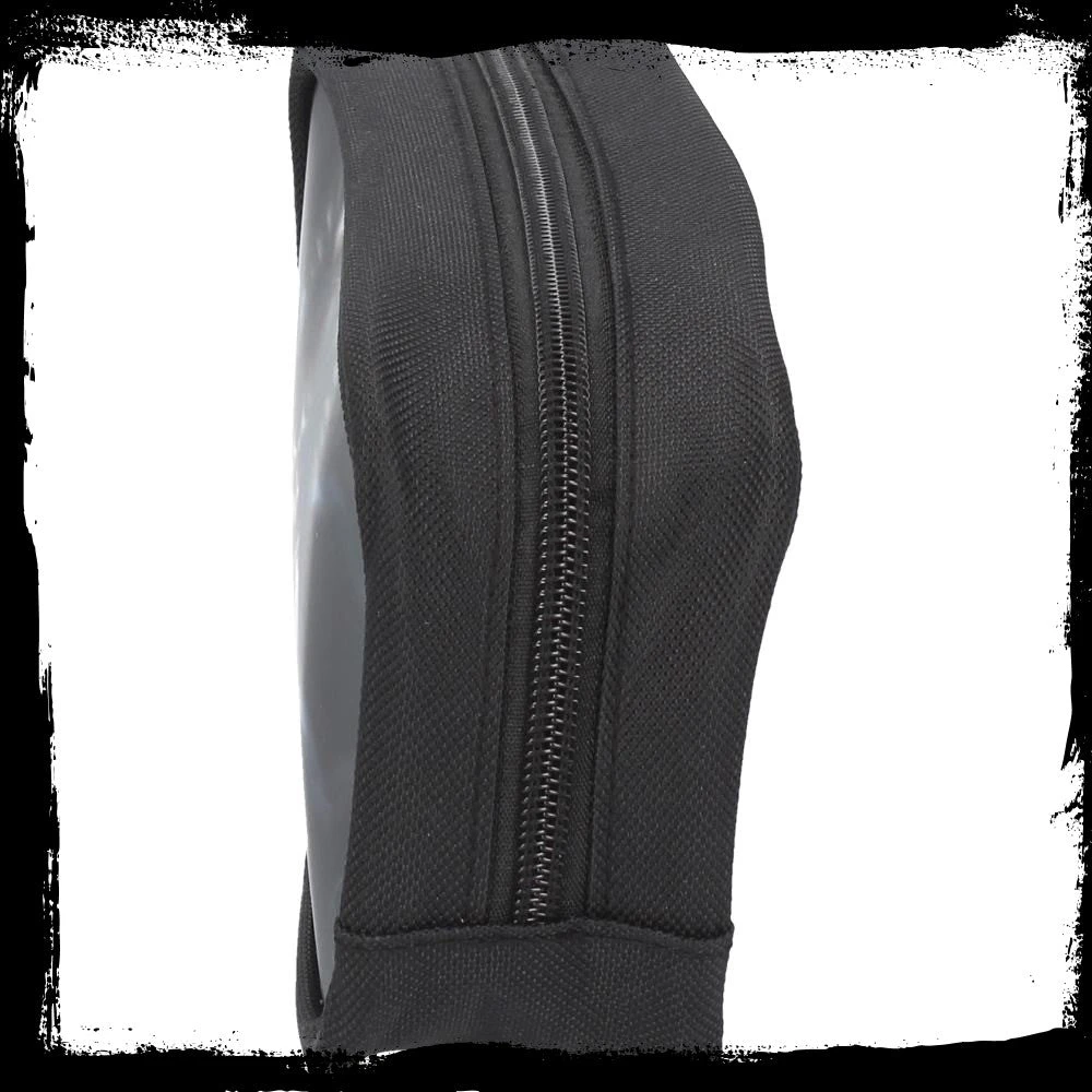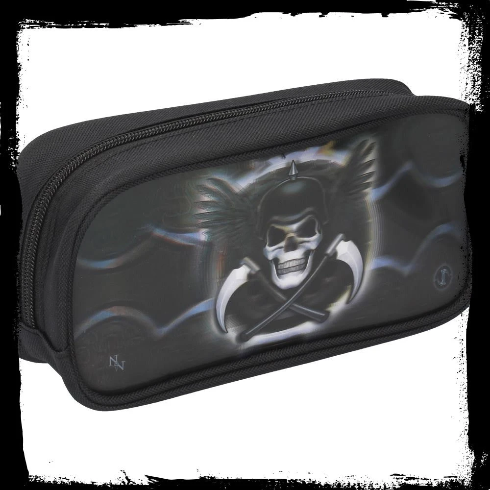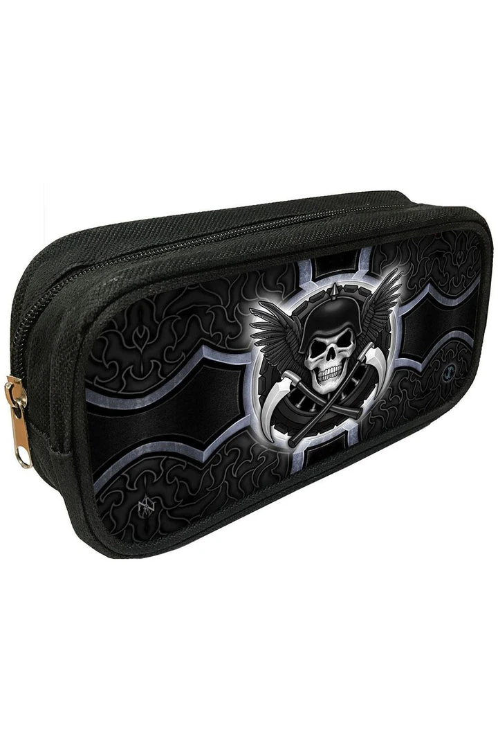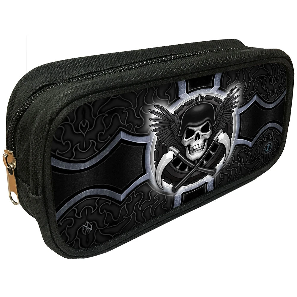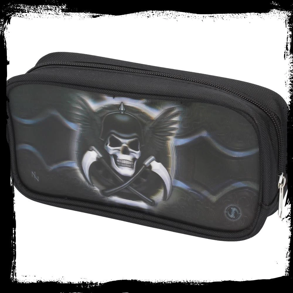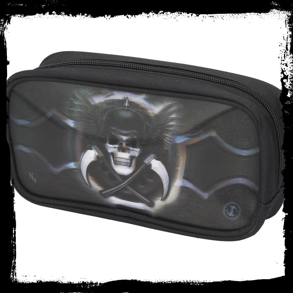 From the world-renowned gothic artist James Ryman, a spacious 3D pencil case. Wearing a black pickelhaube, this grinning skull has crossed scythes beneath it, with black wings rising behind it. Set in the middle of an iron-coloured cross motif, they are surrounded by the silhouettes of flames. The 3D effect adds an extra depth to the already fantastic artwork, and the sturdy zip ensures that your pens and pencils will remain safe. A fantastic gift for any avid biker who wants to keep their pencils safe on the road.