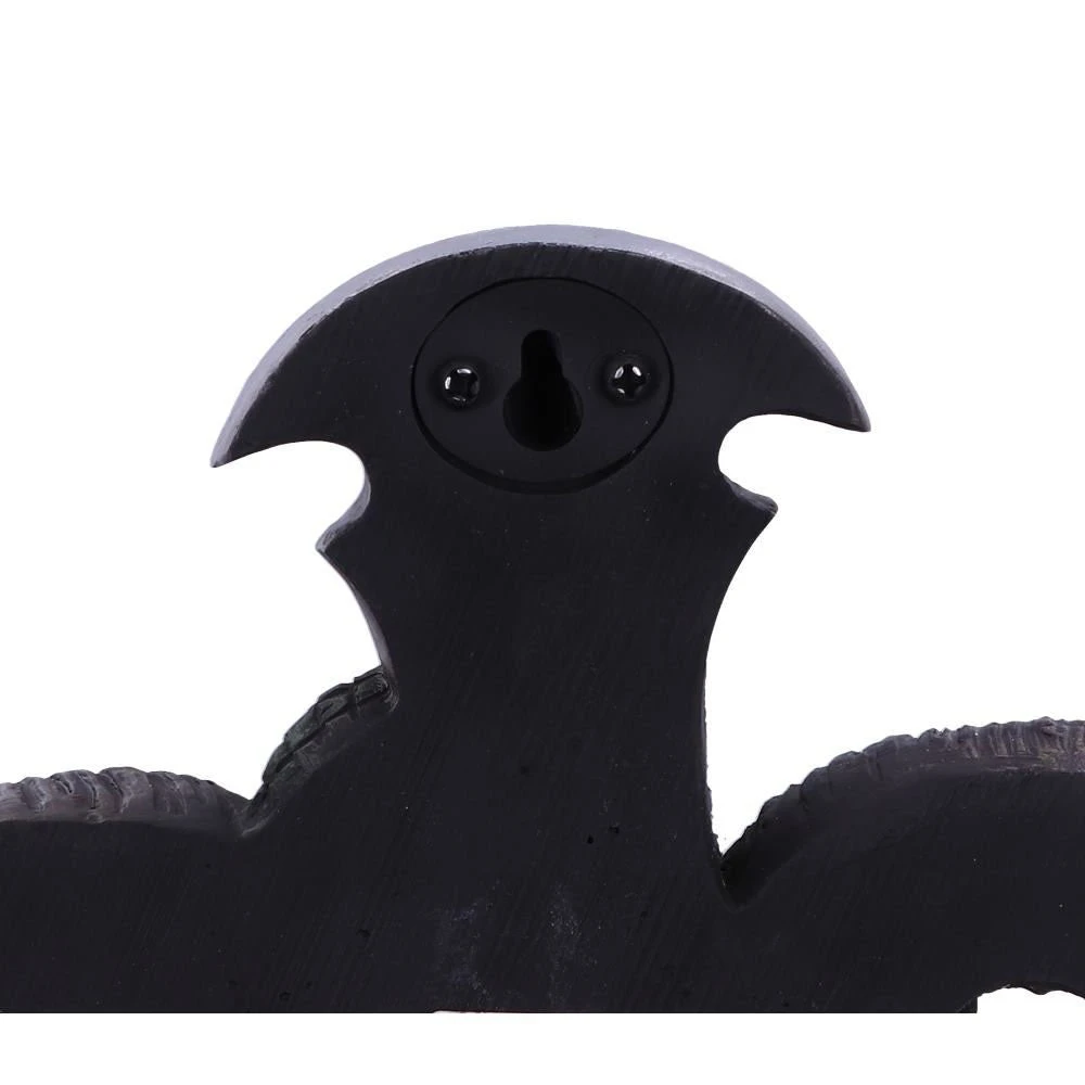From the twisted mind of dark alternative artist James Ryman. Here we have his Devil’s Cross art immortalised in resin, featuring an emerald Serpent and Ram’s skull flanked by two human craniums, suspended on a Petrine Cross, this piece is cast in high-quality polyresin and expertly hand-painted.
