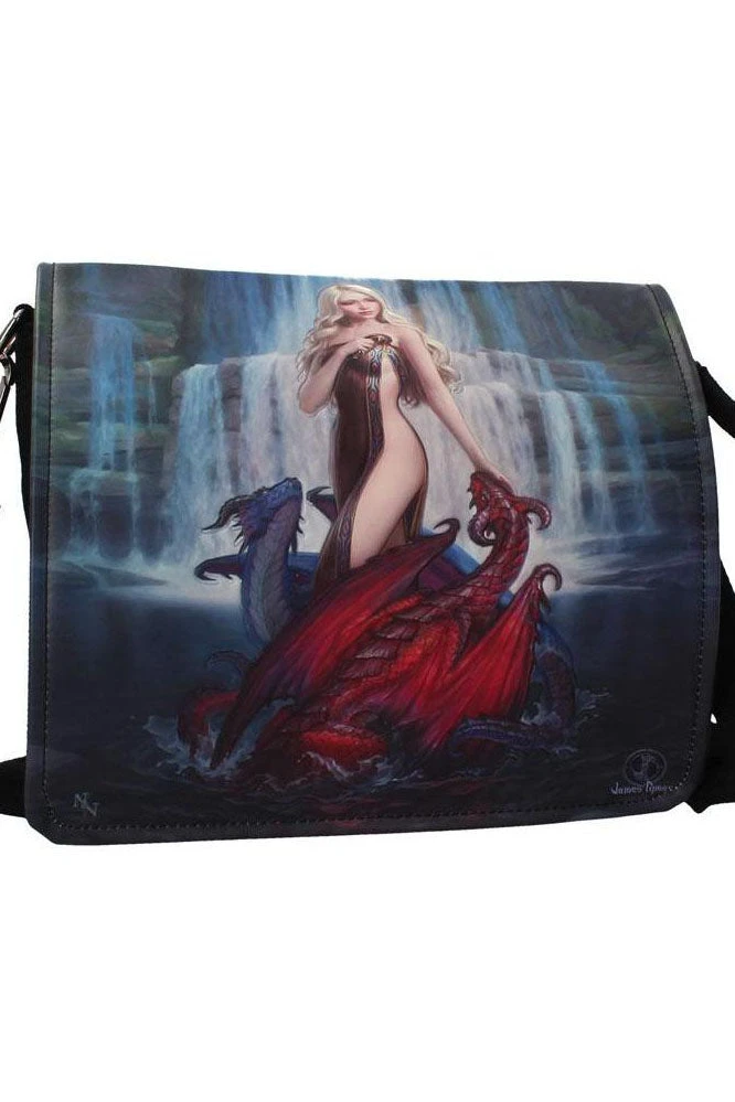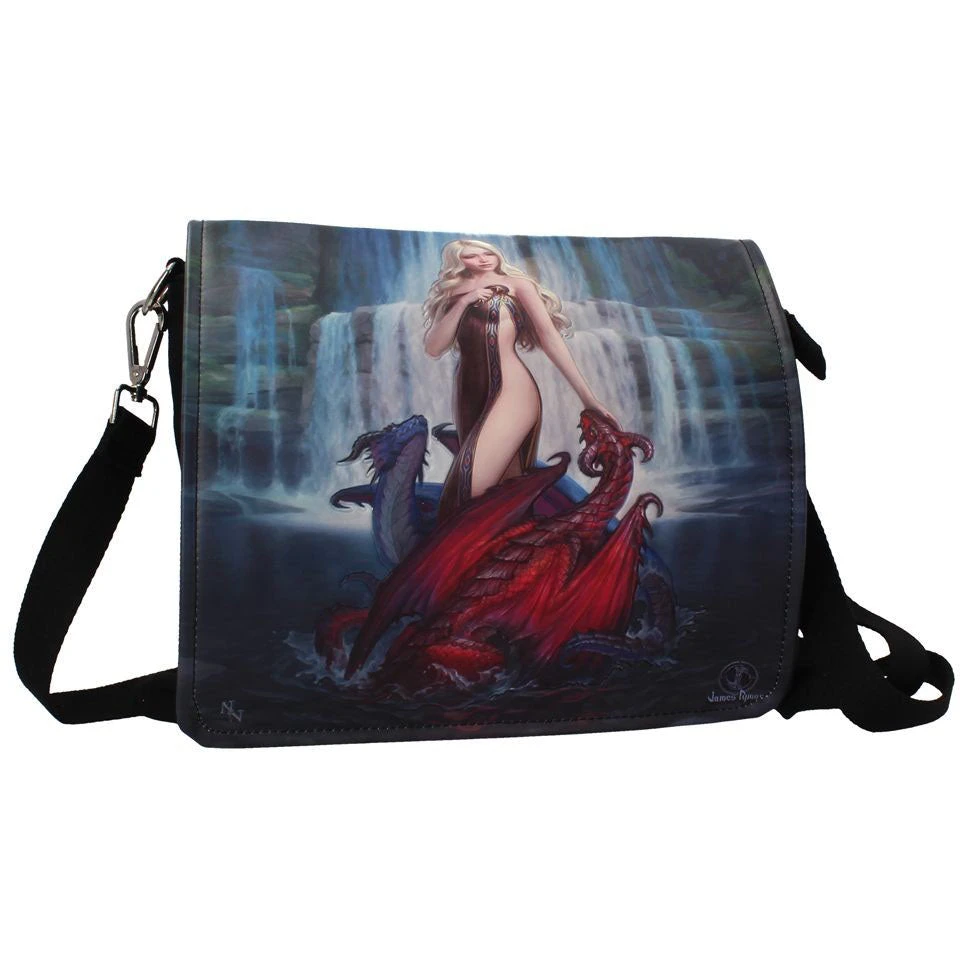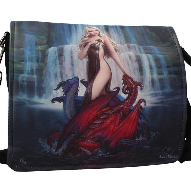 This enchanting shoulder bag comes from the wild and untamed imagination of market-leading fantasy artist James Ryman. Standing in a shallow pool, a waterfall cascading over rocks behind her, a young blonde woman protects her modesty by holding up a robe with her right hand. Two dragons splash playfully around her – one red, one blue – as they look up at her like dogs. She reaches down with her left hand to gently stroke one of them as she gazes down lovingly. This shoulder bag has a smaller front pocket in addition to the main pocket for greater ease and flexibility of storage, as well as an adjustable strap, making it perfect for any trip to a secluded pool with your dragons.