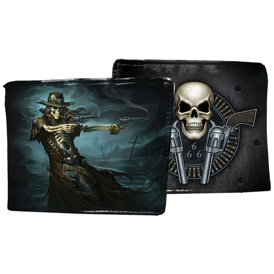 Hands where they can see ‘em, partner. From master of gothic fantasy James Ryman. In a mist-filled graveyard at night, crude wooden crosses marking where the bodies lie, this skeletal sharpshooter stands with pistols in outstretched hands, tattered rags hanging off their bones. Long grey hair blows in the wind from under their brown leather Stetson, and the smoke curling lazily from their cigarette matches the smoke rising from the barrels of the guns. On the back, there is a motif of a skull above the number 666, flanked by two six shooters and contained in a ring of bullets. Perfect for anyone who has a gun and needs to travel with their cash secure, this spacious and stylish wallet makes a fantastic gift.