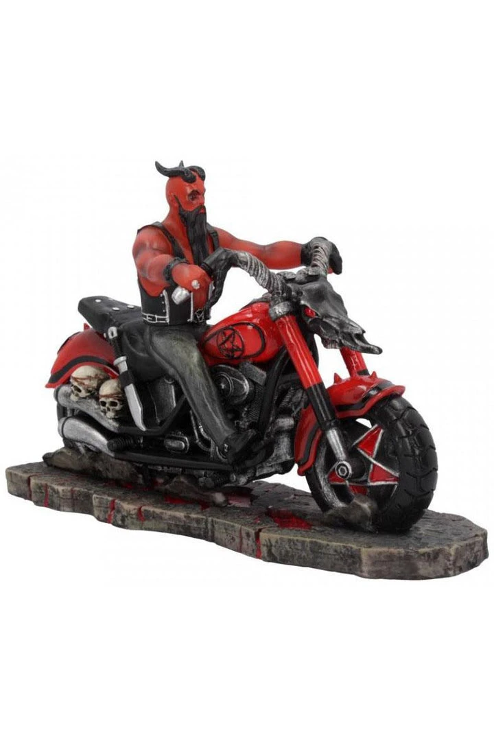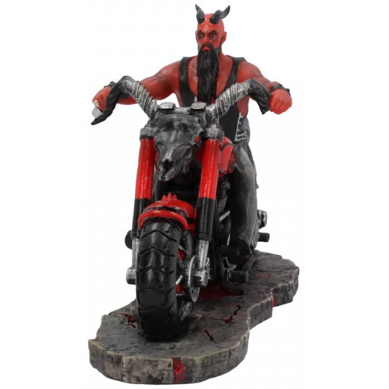 From Gothic and alternative artist James Ryman. On a deserted highway, this devilish rider accelerates towards you, wearing a leather cut and trousers. A machete and two skulls are lashed to the side of the bike and show that the rider is ready to cut down anyone who stands in his way. The floor underneath him cracks, exposing a hellish glow as the biker grabs the handle bars formed from the skull of a red-eyed Demon. Cast in the finest resin before being carefully hand-painted, this would make the perfect addition to any Gothic collection.