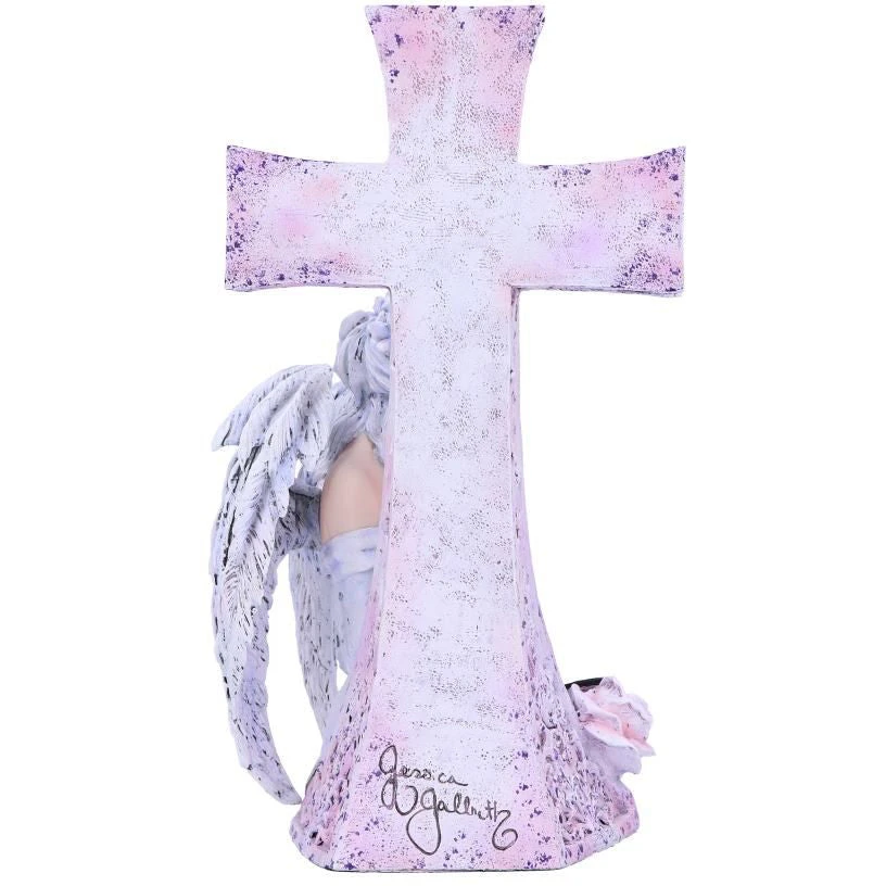 Enchanting, elegant and pure, this beautiful white angel stands close to the pink cross which has the words ‘Weave in faith and God will find the Thread’ emblazoned onto it. She holds onto the lush pink roses which has a butterfly resting upon them. Cast in the finest resin before being expertly hand-painted, this figurine will stand out in any display.