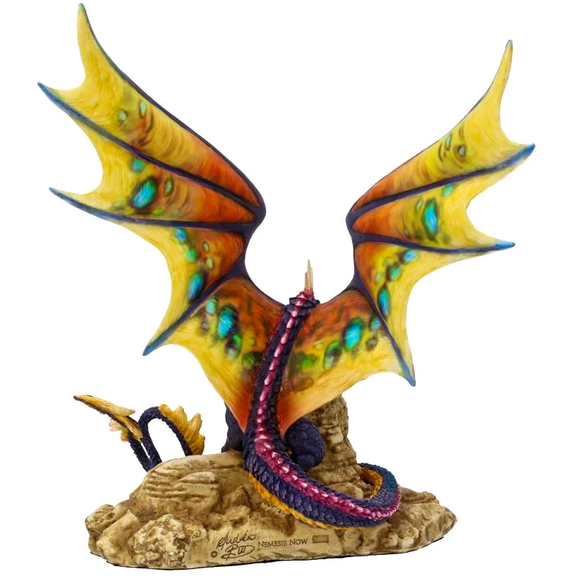 This fantastic Dragon figurine is the work of master sculptor Andrew Bill. Climbing over the Sphinx of Egypt, dwarfing the ancient monument, this colossal purple Dragon leers downwards at an unseen interloper, orange and yellow wings raised high in a threat display. A red ridge runs down their back with vicious white spikes protruding from it. Their long, thin tail curls possessively around the sphinx, as if claiming it as a part of their hoard. Cast in high-quality resin before being lovingly hand-painted, this Dragon brings a taste of the dry, hot winds of the desert to any home.