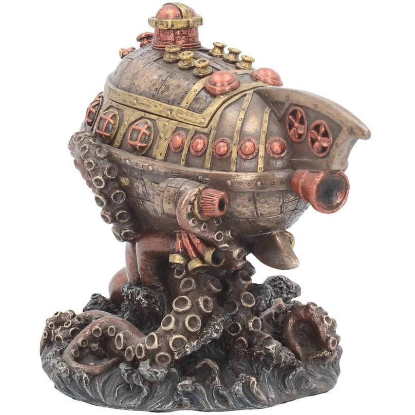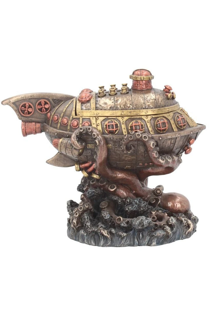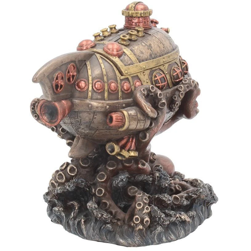 This stunning Steampunk Statue made from resin has a high level of fabulous detail finished in copper and bronze tone metallic effect. Leviathan’s Escape features a octopus rising from the deep to wrap it’s tentacles around a steampunk submarine style ship. An eyecatching addition to your Steampunk Decor and also fuctions as a trinket box with the top of the submarine being removable to reveal a small space to store trinkets!