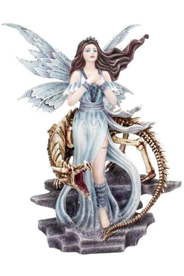 Expertly hand-painted. Standing on a rocky outcrop, this young Fairy wears an icy blue dress, flowing down to the floor and slit to the thigh. She looks into the distance as her dark chestnut hair flows in the breeze. Large frosty wings spring out from her back, spread wide, as a fierce Dragon stands by her side, warding off any ill-wishers. On closer inspection this mythical creature is not what he seems, his body made up of fleshless bones. Cast in the finest resin, this enchanting figurine radiates an aura of power and control that any can share in.