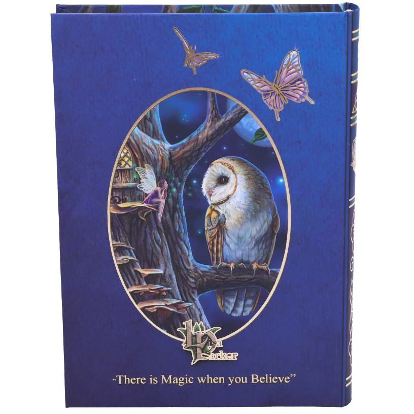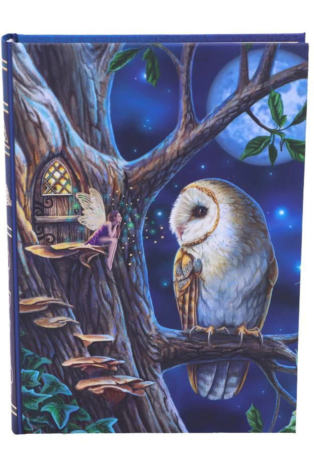 From the magical mind of fantasy artist Lisa Parker, comes this enchanting Fairy Tales Journal, perfect for keeping all your secrets safe. A large owl perches on a sturdy branch, talons gripping the bark as tight as they can, whilst a small fairy sits on the edge of a bark mushroom. A small fairy door can be seen behind her, inside glows and makes you feel warmth and homeliness. Wearing a purple dress she leans forward, her brunette hair sweeping over her shoulder. This pair makes the most unlikely companions, yet they stare lovingly into each others eyes underneath the night sky. Inside the journal, high-quality plain paper gives you the freedom to record your magic and dreams unimpeded.