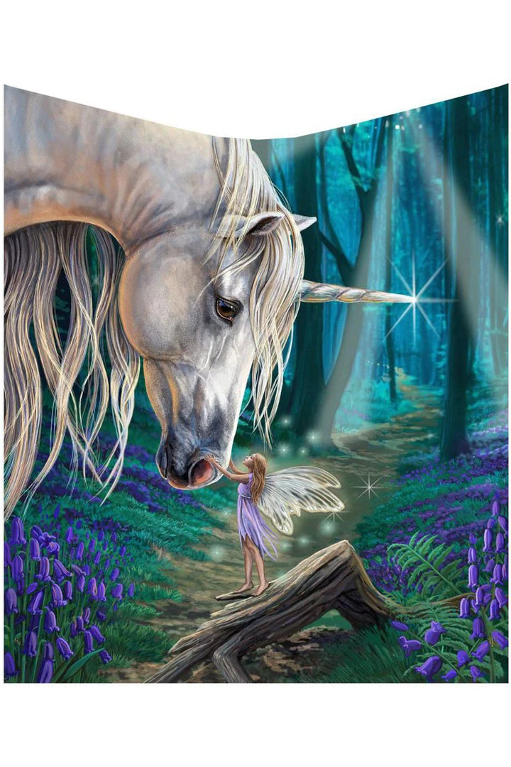 From the Magical mind of Fantasy artist Lisa Parker, comes this enchanting throw. This throw is soft to the touch and is perfect for those cold winter nights. On the surface of the forest floor two magical creatures emerge and reach out to one another. A tiny Fairy stands atop a fallen tree branch as it reaches upwards, greeting an adult Unicorn which cranes downward, just close enough so that the Fairy can touch the Unicorn’s nose. The fairy wears a tattered lavender dress with her translucent wings reflecting the moon’s light as it filters through the treeline above.As the Unicorn cranes downwards its long, untamed mane follows. Behind the mystical creatures is a lush bluebell wood during twilight, completing the magical scene. This fairy tale throw is magically soft, making it perfect for any chair, sofa or bed.