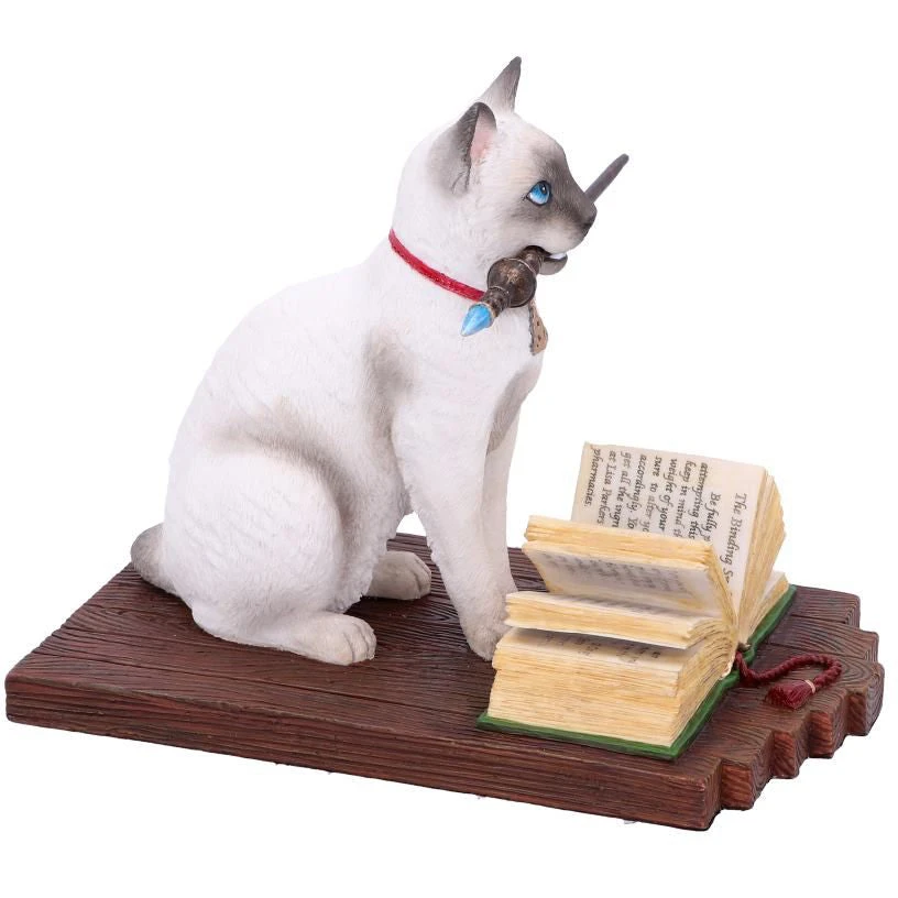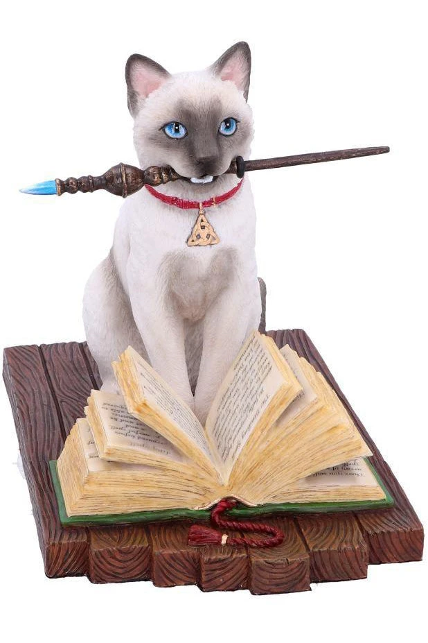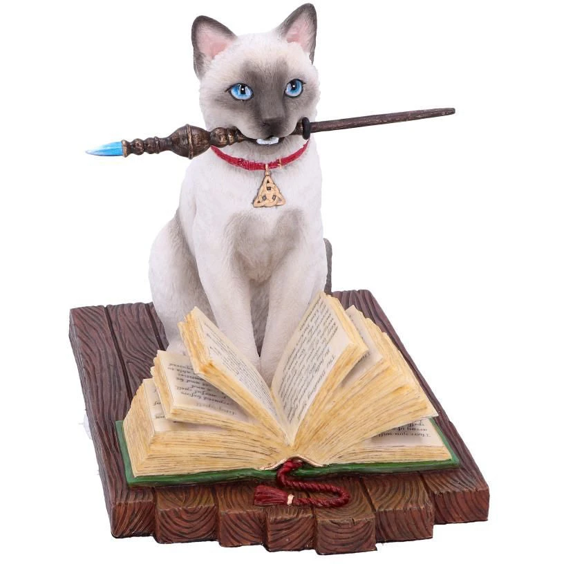 From the untamed imagination of Lisa Parker. Not just your ordinary moggy this Blue Point Siamese wears a red collar, decorated with a triquetra talisman. Sat on a wooden perch, this familiar has a crystal wand grasped firmly between her small fangs as her icy blue eyes stare straight ahead. A spellbook sits open in front of her, the page reads “The Binding Spell. Be fully prepared before attempting this powerful spell. Keep in mind the size and weight of your subject and be sure to alter your quantities accordingly. You will be able to get all the ingredients required at Lisa Parker’s magical pharmacies. There you will find a vast array of powerful potions and spells, simply the best in the business! Purchase the following ingredients, 2oz of dragons blood, five white candles, organic silk woven cord, lavender, Irish Charcoal and corn”. Cast in the finest resin before being expertly hand-painted, the beautiful detailing enhances the magic of the piece, making it the perfect addition to any bewitching collection.