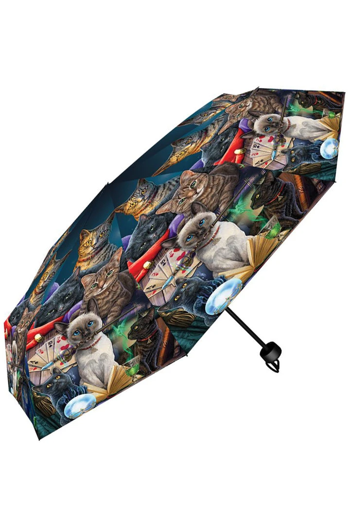 From the magical artwork of Lisa Parker. Featuring a group of adorable enchanted felines, sat amongst some old spell books, all waiting to cast some magic. Potions, cards, crystal balls and more, inquisitive and mystical these cats wait patiently for their time to come. Extending to 55cm in length, with a spacious span of almost a metre, this umbrella compacts down to a mere 5cm across and 24cm long for easy carrying and storage. Perfect for keeping sheltered from the rain whenever you need.