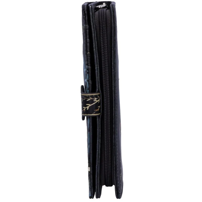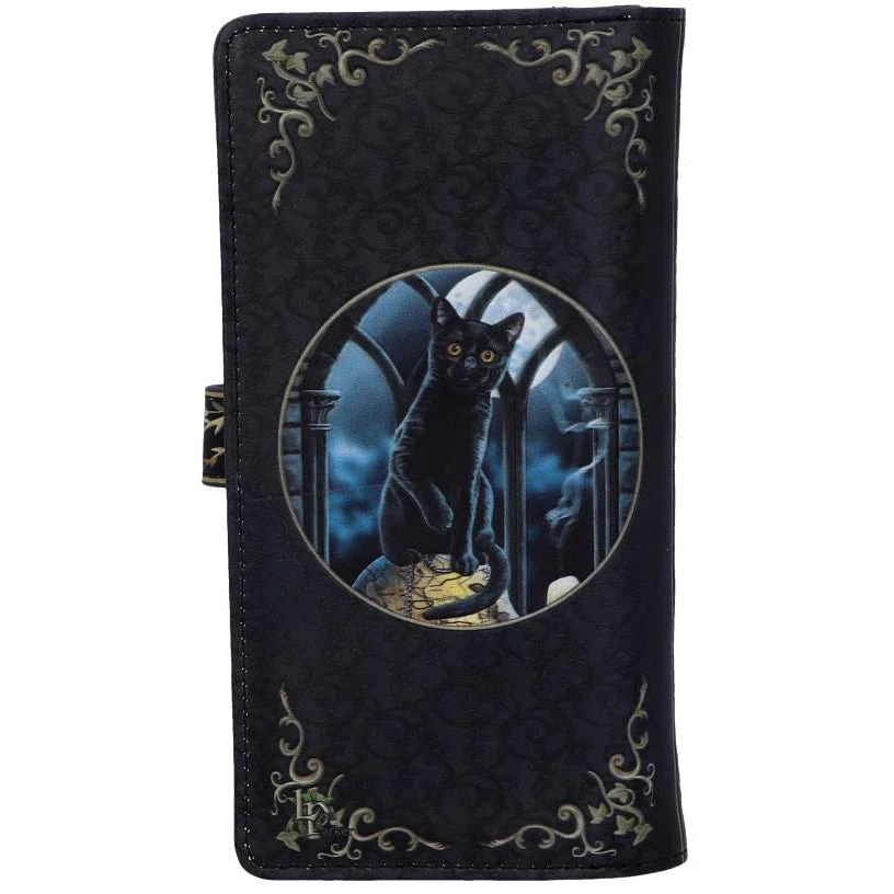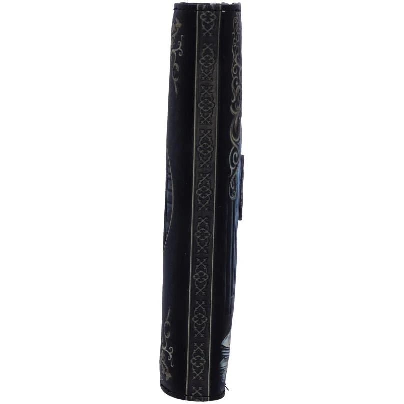 From the untamed, enchanted imagination of world-renowned artist Lisa Parker. Embodying the true spirit of Salem, this jet black witch’s familiar sits above an aged skull. The carving in the skull is a true map of Salem from the times of the harrowing Witch Trials, making this piece even more meaningful than initially perceived. Underneath the cranium is a stack of ancient newspapers, outlining the horror of the trials. Intelligently executed and full of significance, this purse is a perfect reminder of the persecution faced by our elder witches, but through their struggle, we thrive. The beautiful embossed detailing enhances the magic and creates a striking 3D effect while the large compartments make it a wonderfully practical piece.