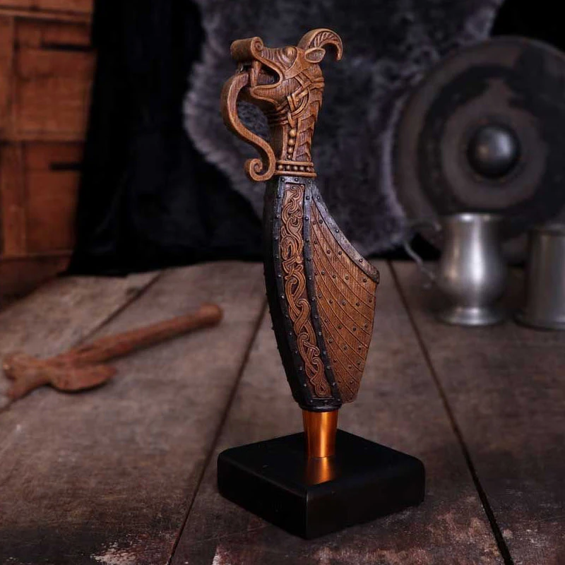 Stood on a black stang, a bow of a boat can be seen. Featuring a dragon’s head, which can be seen sticking its tongue ours towards any onlookers. With a wooden effect and Celtic patterning, this rustic ship ornament is a show-stopping product that will leave your customers wanting more. Cast in the finest resin before being expertly hand-painted, this product is the perfect addition to any medieval collection.