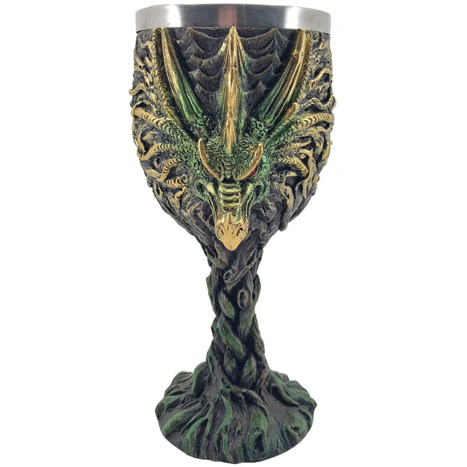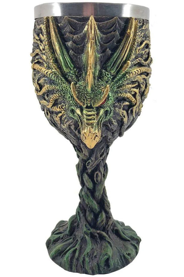 This exquisite Dragon Goblet is perfect for any fan of these mythical beasts! The base and the stem of the Goblet form a complex root system that form the Goblet itself. Pictured at the centre is the head of green dragon with gold accents on its nose and horns. Cast in the finest resin before being expertly hand-painted, this piece features a removable stainless steel insert for ease of cleaning and can add a touch of the mythological to any drink.