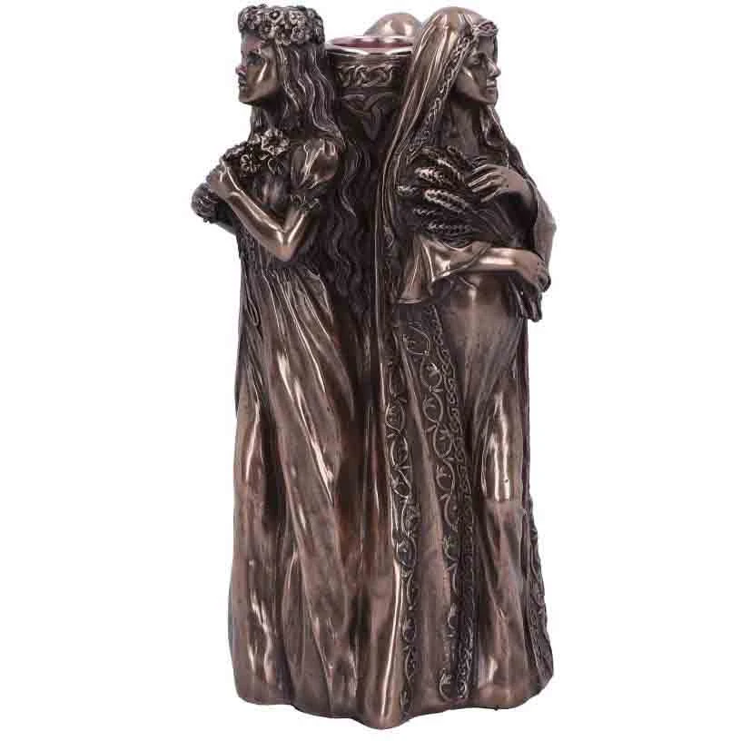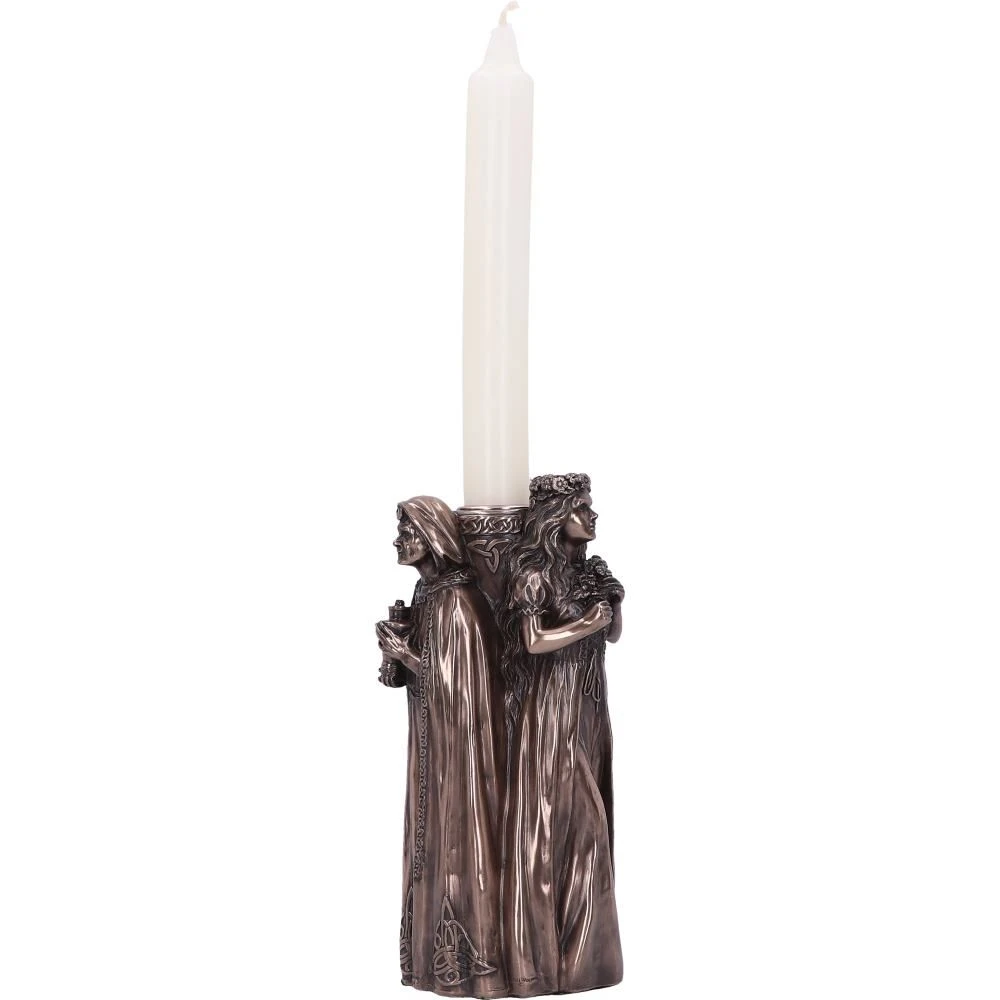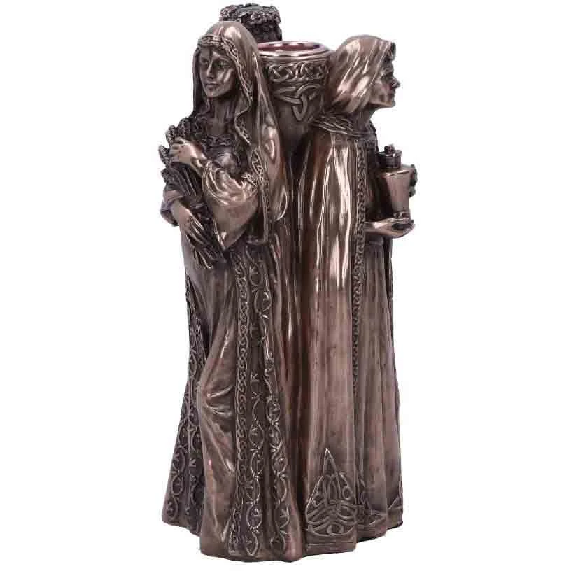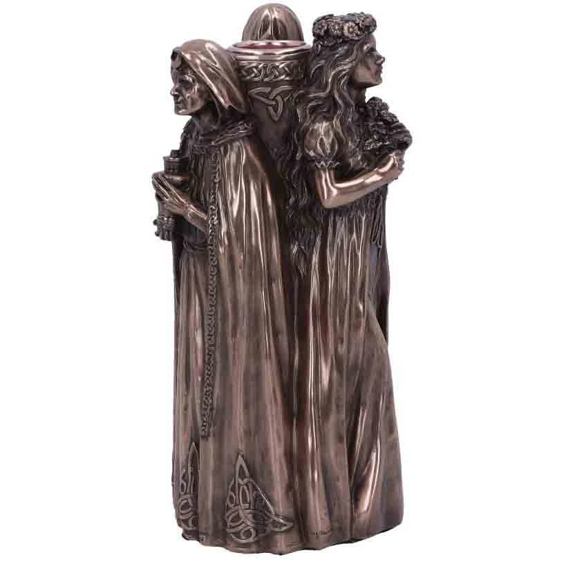 Cast in the finest resin before being given a bronze finish and painstakingly hand-painted. Three women of different ages stand with their backs to the base of the candle holder. Which at the top contains a small tray, suitable for holding your favourite scented candlesticks. Symbolizing the circle of life, this candle holder pays tribute to Wiccan and Pagan beliefs. Making this candle holder the perfect addition to any alternative gift store.