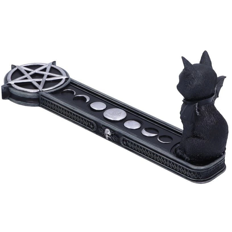The cat who appears to be a vampire spirit, encapsulated by bat wings protruding from its back, sits peacefully of the end of the burner. At the other end is a pentagram symbol, along with different silver moons that are placed down the middle of the burner. This piece is cast in the finest resin before being expertly hand-painted and is perfect for burning your favourite incense scents.