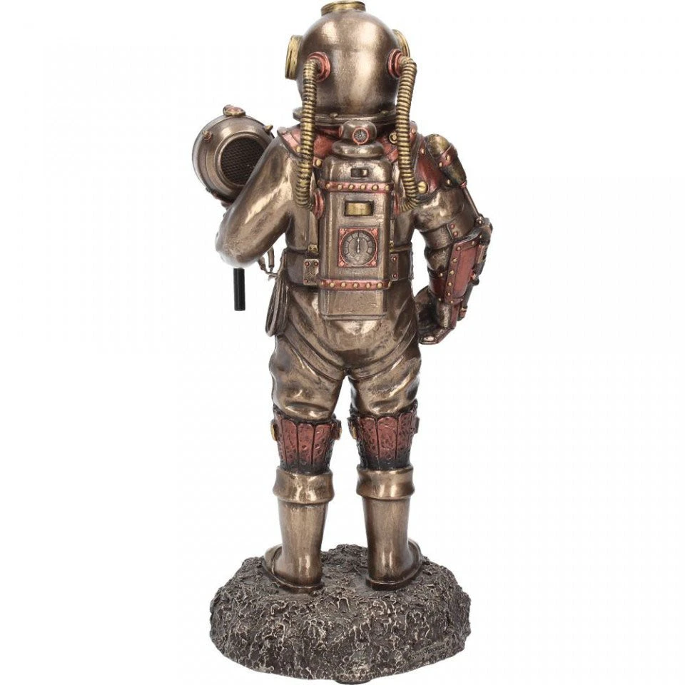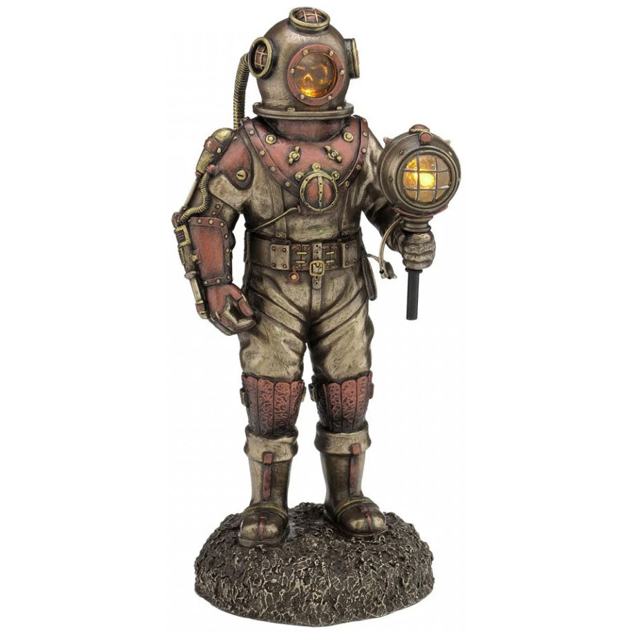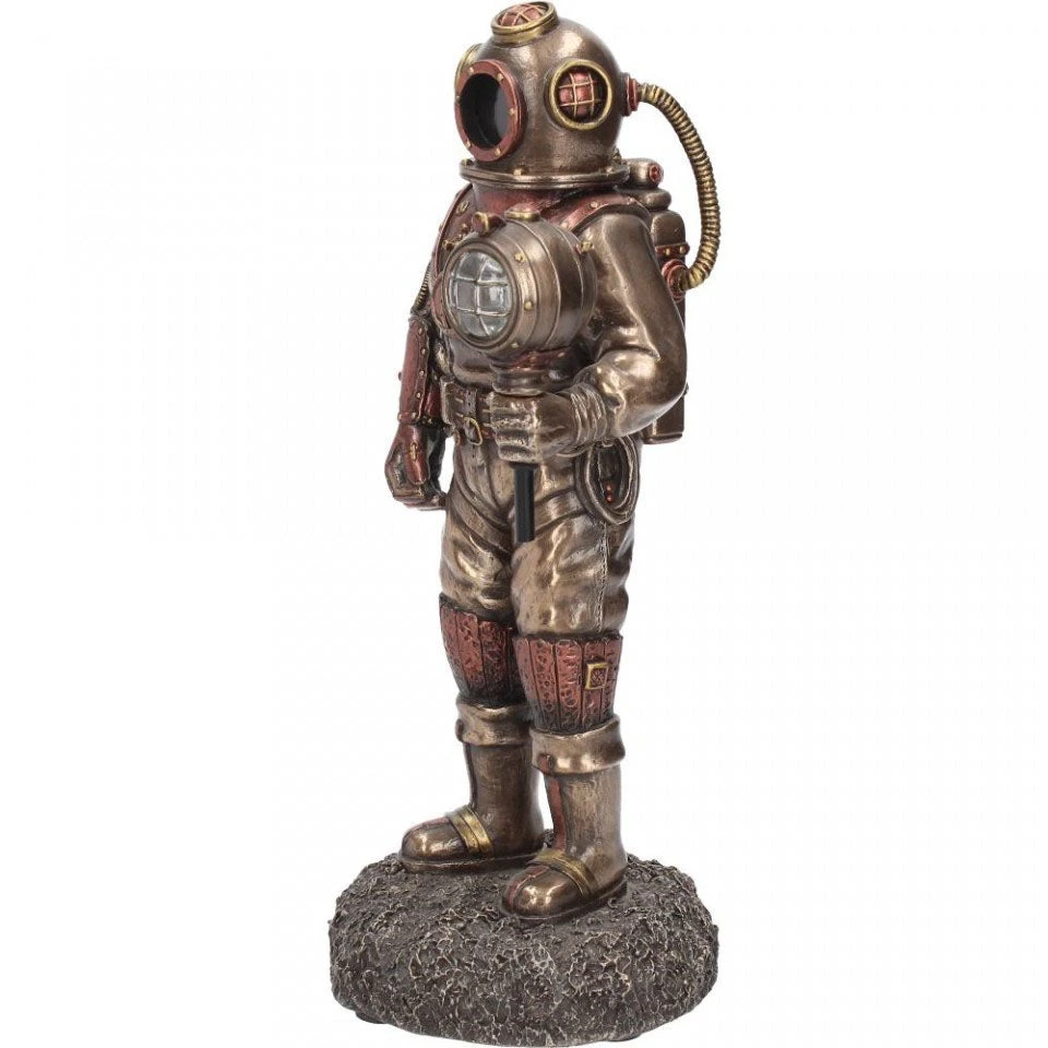 This nautical nightmare is cast in the finest resin before being carefully hand-painted. Walking along the ocean floor, this diver is wearing an old-fashioned diving costume, complete with brass helmet and weighted boots. In their left hand they hold a lamp, reinforced against the crushing pressure, and their right arm is reinforced with a hydraulic mechanism. The window at the front of the helmet reveals that within the suit lies a skeleton – the corpse of an underwater explorer that perished long ago. Perfect for any lover of the sea who also appreciates the darker things in life, the torch and face contain LEDs, providing a truly terrifying experience in the inky depths.