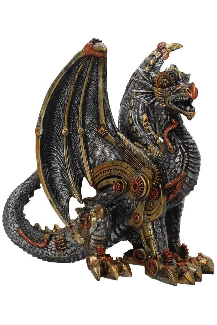 Guard your workshop with the Mechanical Protector. Standing proudly, a mechanical dragon roars, wings spread menacingly. Interlocking steel plates form the scales of the dragon, brass cogs and bronze plates reinforcing and providing mobility. Cast in high-quality resin before being expertly hand-painted, this mechanical dragon makes the perfect guardian.