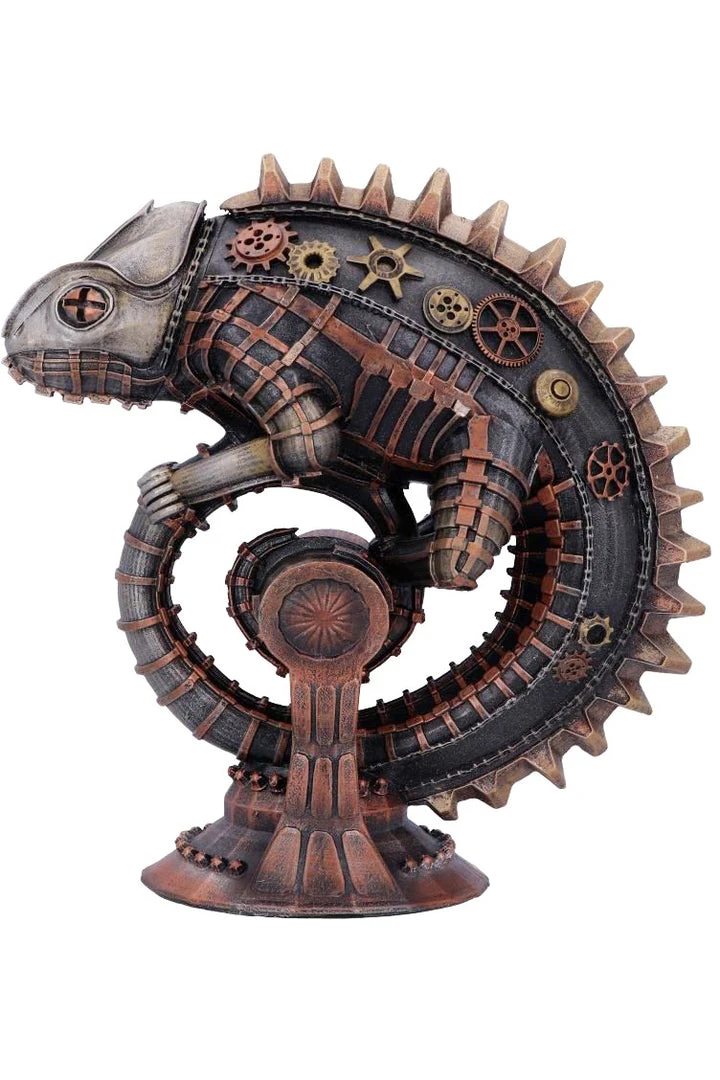 Cast in the finest resin before being given a bronze finish and hand-painted. Coiled around a mechanical perch, this lizard has two large screws to replace his protruding eyes and is covered in cogs, gears, rivets, screws and copper accents. This piece would look great in any steampunk collection.